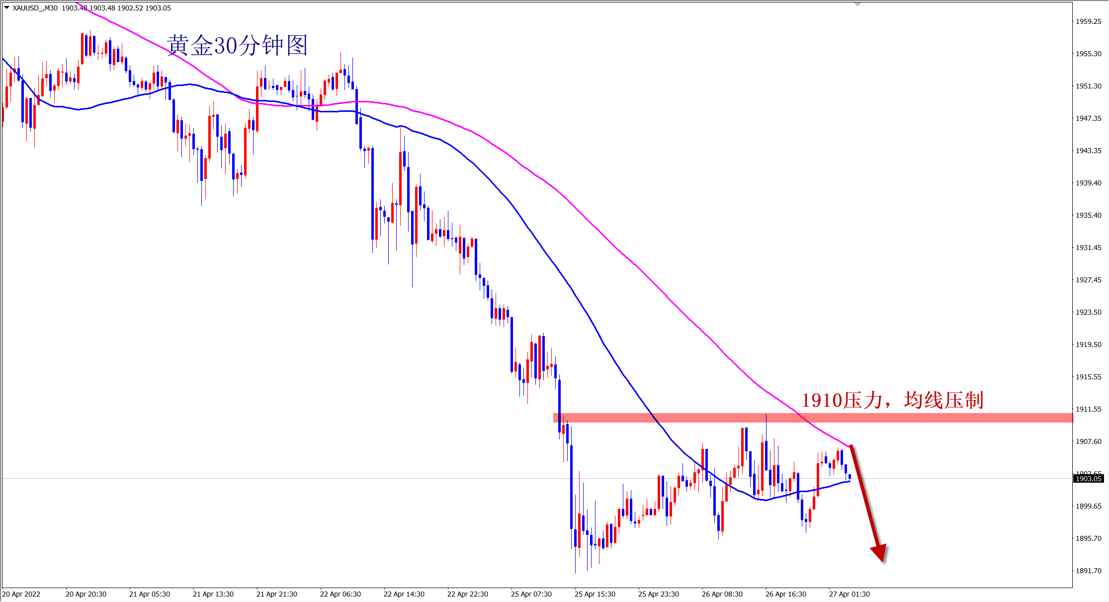 黄金破位下跌后,只有一个字“空”!空单已连续大获全胜,难道您还在做多?个人观点非常明确,没有反转信号出现之前只会将顺势做空进行到底。1910压力都不能突破,最终的结果只有一个,跌!