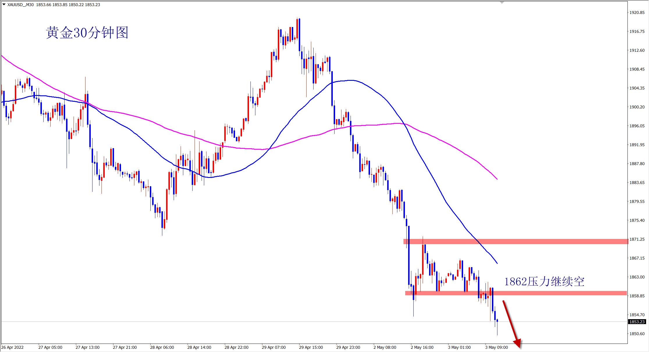 黄金1865下空,止损1873,目标1840-1830;