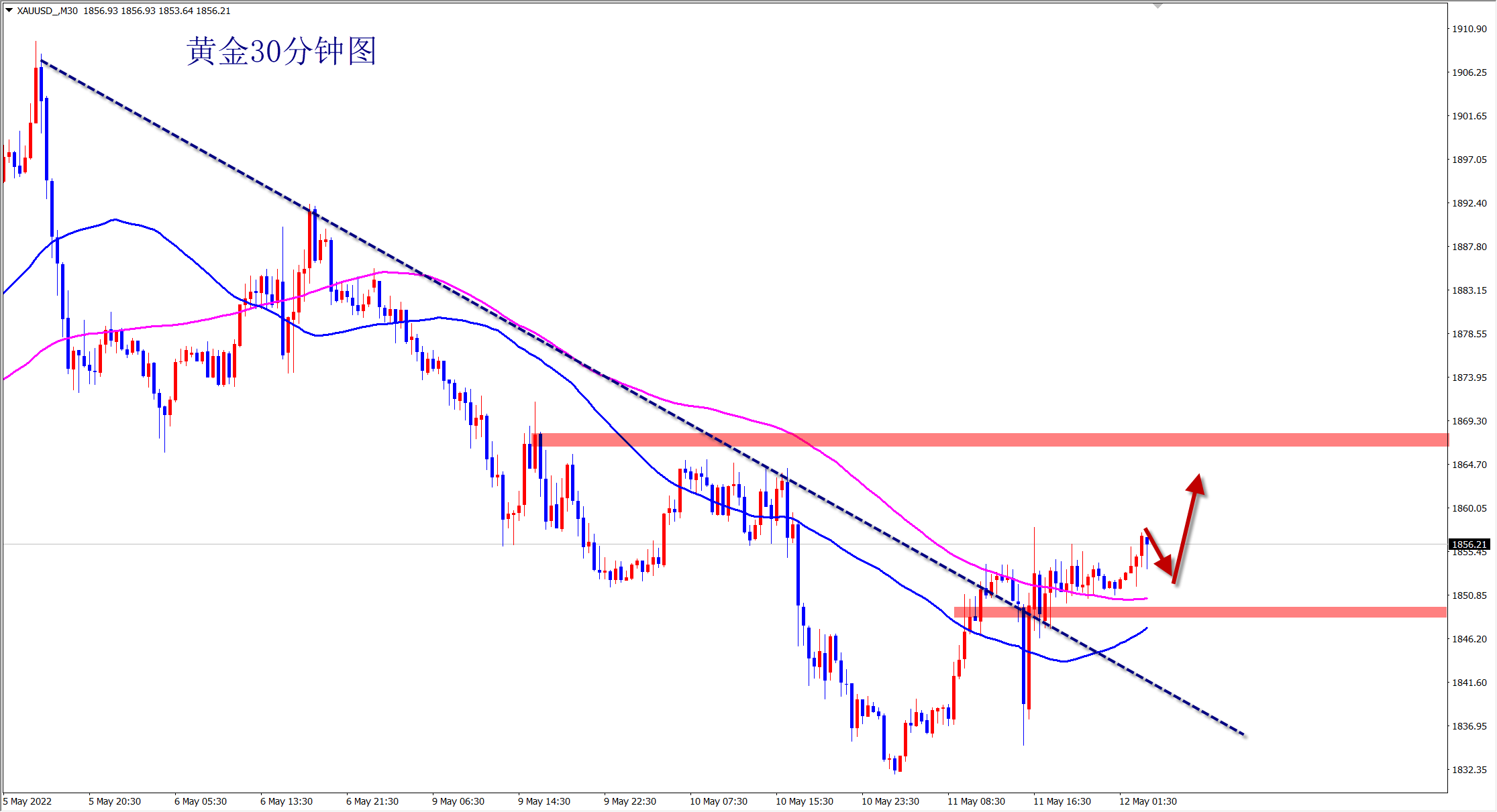 黄金此前一直是阴跌的走势,但是昨日开始改变,并且美盘数据后虽然大幅杀跌,但是没有新低,并且直接拉升并突破反弹高点,趋势改变,操作上也要及时的跟上行情。不做死多头也不要死空头,而是根据实际的走势,灵活应变。