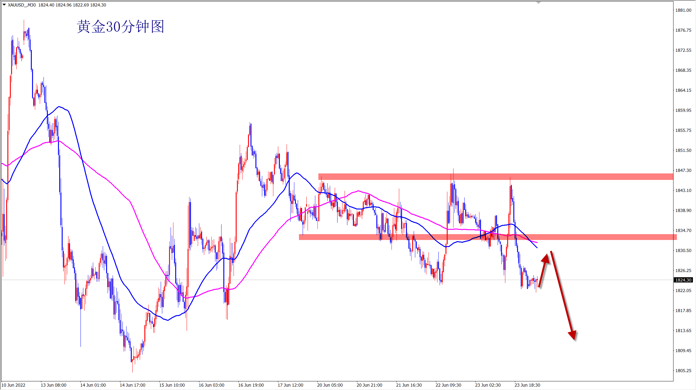 黄金整体上还是偏空的走势,上方1848位置的压力非常明显,多次震荡反弹都没有突破,而且每次遇阻后都是大跌。虽然1823位置也有支撑,每次都是强势反弹,但是今日早盘行情反弹无力,破位的概率加大!