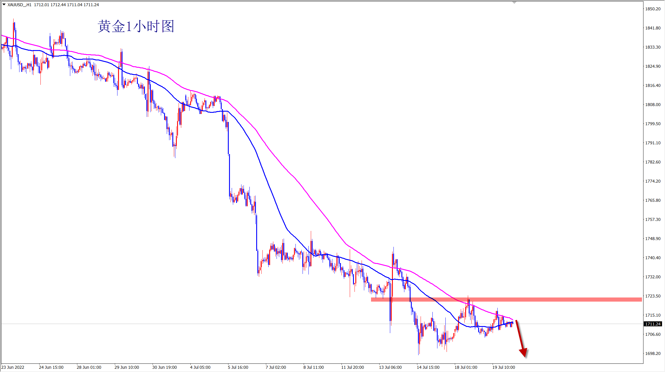 黄金当前暂时受到1700的支撑震荡,但是反弹力度不足,上方未能突破1723位置的压力,依旧是空头跌势,早盘依托1720继续干空!