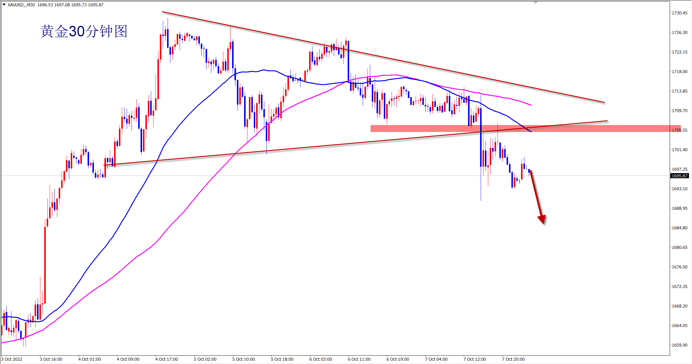 黄金三次冲击1730的压力都未能突破,周五非农数据利空,更是直接破位下跌!随后的反抽未能重新进入到此前的震荡区间内,破位有效,行情转跌!接下来开始高空看跌了!早盘反弹后直接空!