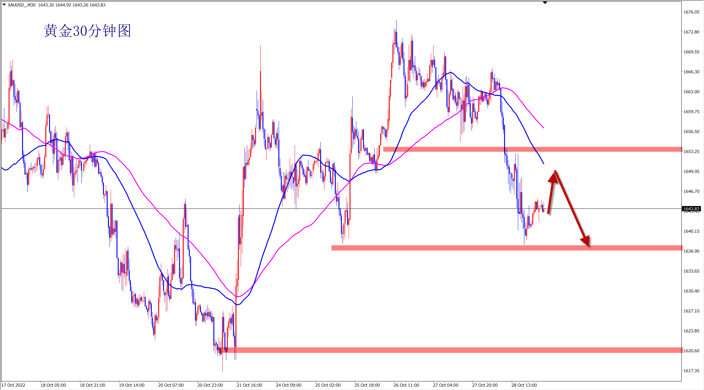 黄金周五破位,开启下跌走势,我们1646反手空,如期下跌获利!当前跌势不变,早盘依托1650压力继续干空!