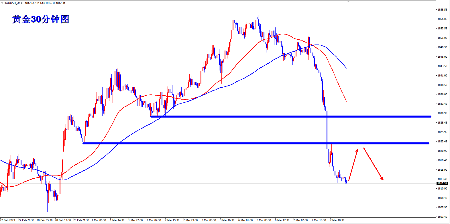 黄金30分钟双顶结构,同时均线开始死叉运行,昨日大阴杀跌,空头趋势明显,基本没有什么反弹,那么今天继续干空,黄金空头重启,早盘反弹1830附近继续干空。王杨从来不做死多头也不做死空头,市场不适合一根筋,要顺应市场,现在空头强,那就将空头进行到底。