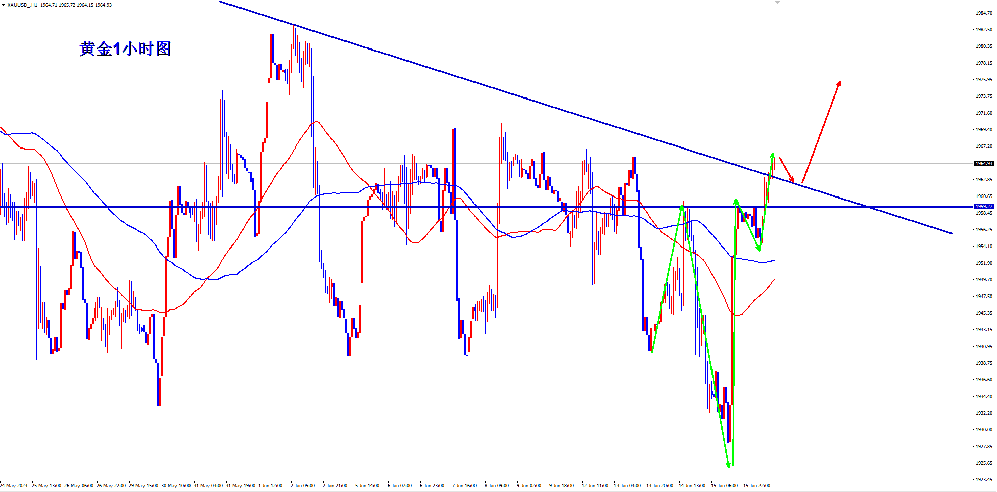 黄金30分钟均线已经金叉向上,1小时收口也即将金叉,而且黄金再次上涨突破了1小时下行趋势线的压制,1小时深V反转之后回踩确认支撑继续上涨,不断创出新高,黄金多头强势,美盘回落1959附近还是继续干多。
