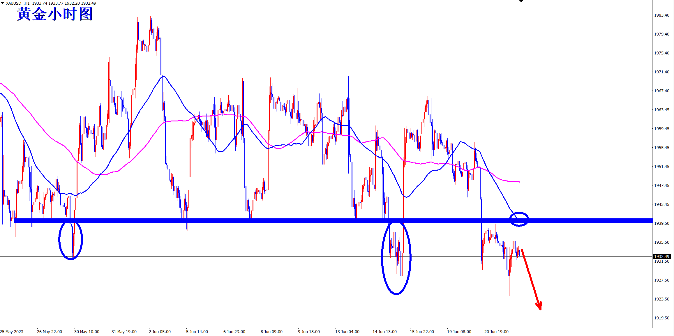 黄金1小时级别上已经跌破了此前的大盘整支撑,而本次破位和此前两次不同,此前两次都是破位后大阳线快速拉起,重回区间内部!昨日虽然也大阳线拉升,但是没有重回区间内,所以是破位后的反弹,属于破位确认行情!