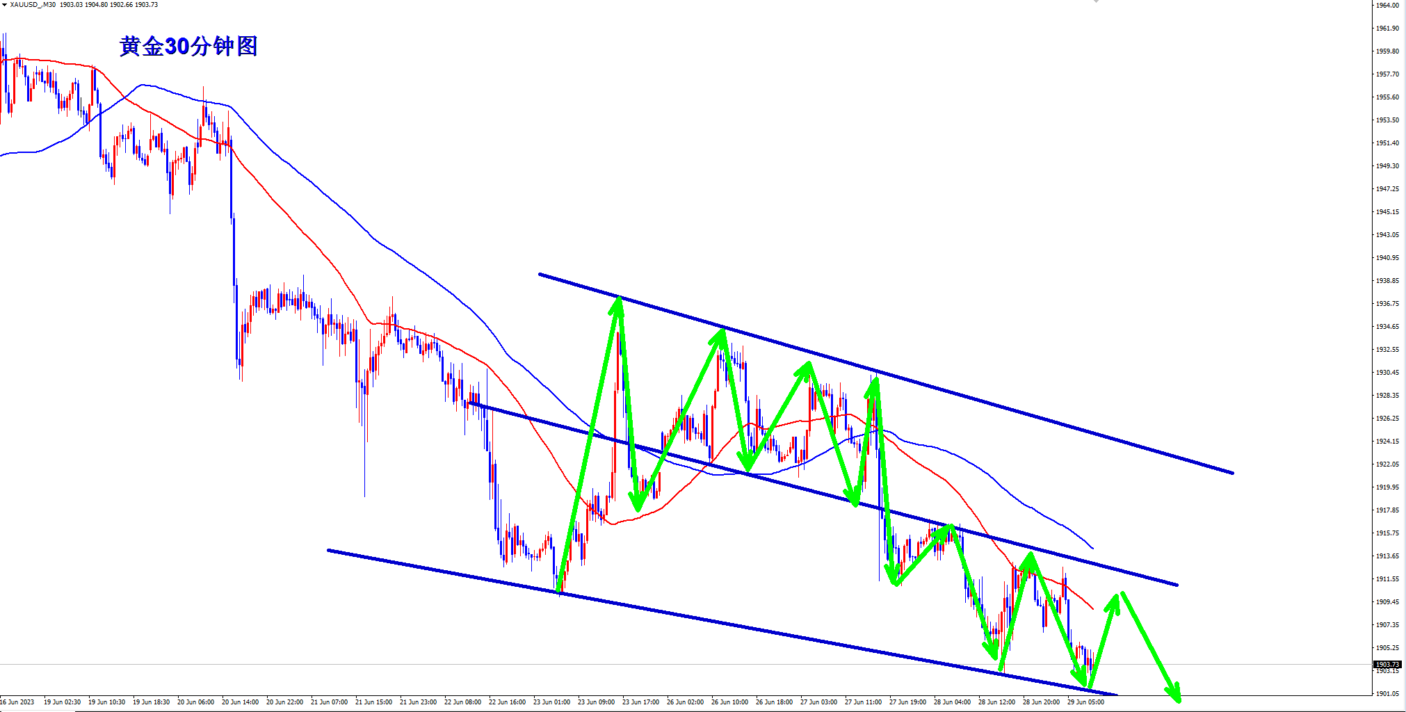 黄金中长期继续三重顶压制黄金,这两日黄金继续下跌也刚好印证了我们周末文章所说的黄金日线迎来C浪下跌。黄金短线来说黄金30分钟下跌通道下跌破位之后又开始形成了新的下跌通道,中间原来下跌通到的下沿的支撑线现在转化成新的下跌通道的的阻力线,目前位置下移到了1912附近。欧盘1912下继续看空不变。