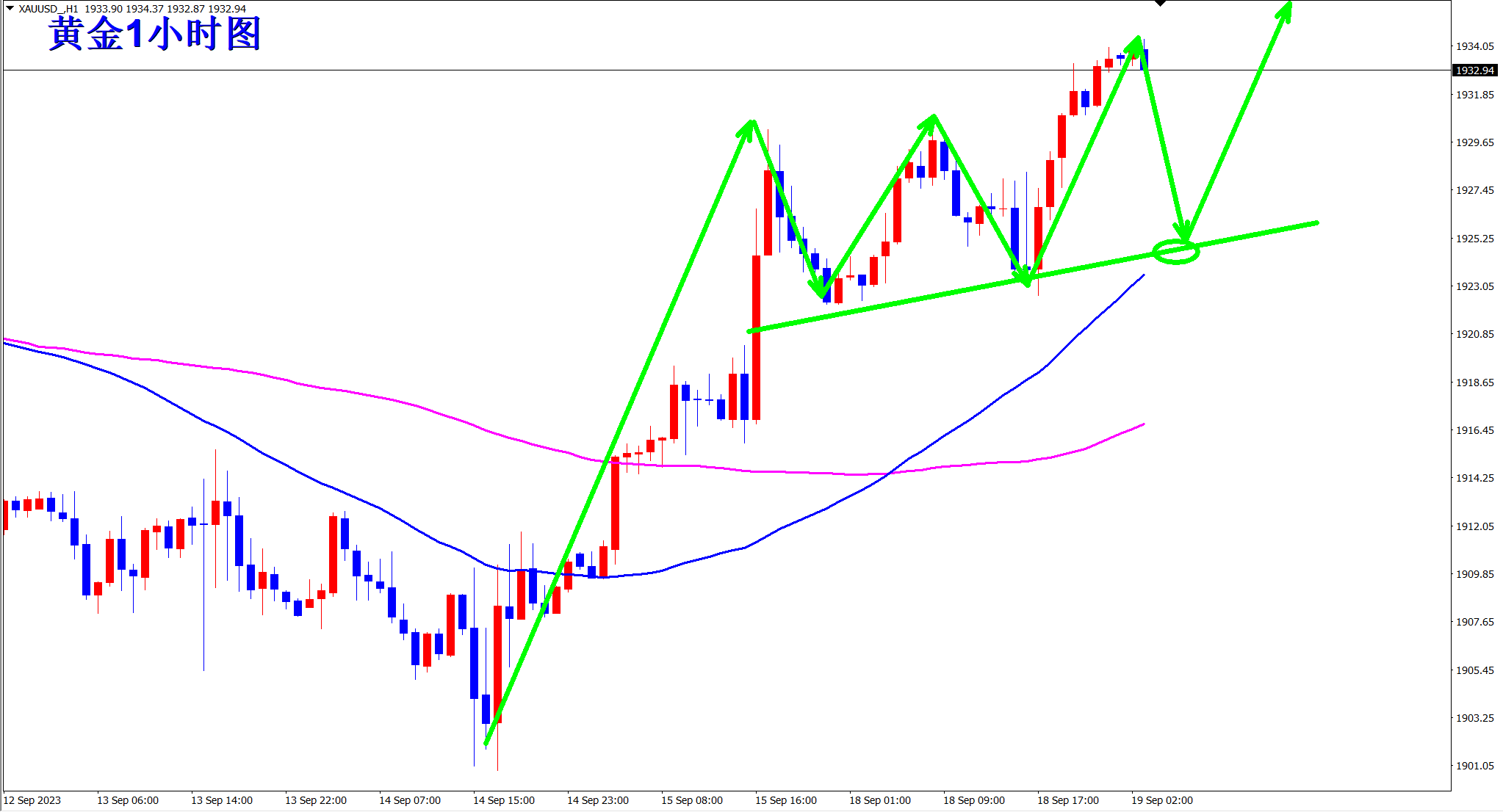顺势轻飘飘,逆势乱糟糟!方向对了不怕路远,最近行情波动有限,操作上保持耐心!当前黄金1小时级别上震荡上扬,每次回落都是干多机会!当前低点连线和均线的支撑落在1925一线!