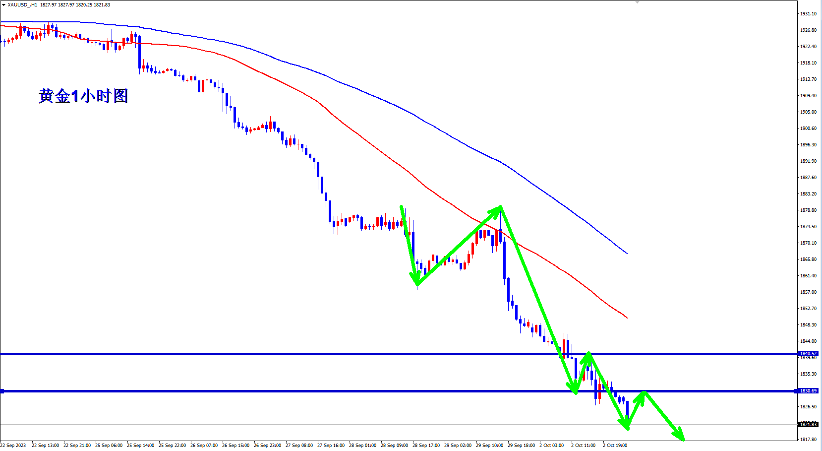黄金1小时均线继续死叉向下发散运行,而且不断跌破新低,基本上没有什么大的反弹,可以说是弱到了极点,多头等上涨,却一直创新低,空头等反弹进场却一直不给上车的机会。所以看准趋势就是要干,不然错过了就是又是拍大腿的节奏。我们一直提倡顺势而为,弱势无反弹的行情接下里就是加速,所以昨日当别人认为跌了很多可能位置很低的时候,我们继续直接干空。黄金昨日一直在1830上方徘徊,现在连续跌破,1830现在已经变成强阻力了。日内反弹1830阻力继续干空。