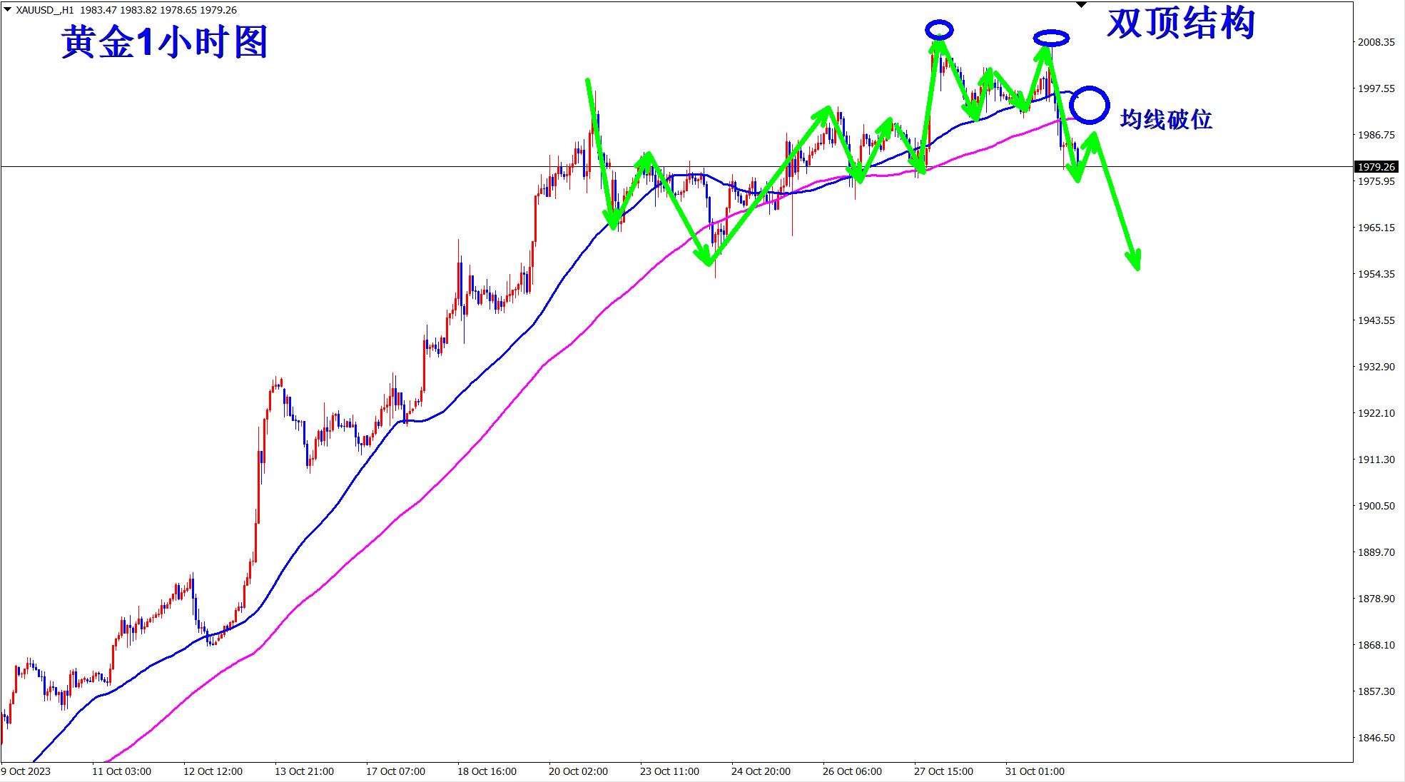 势不变则守,势变则随!此前黄金一直维持在1小时级别的均线上方运行,所以我们一路低多看涨!但现在行情已经发生改变,当前k线已经跌穿均线支撑,意味着多头上涨趋势结束,空头开启!
