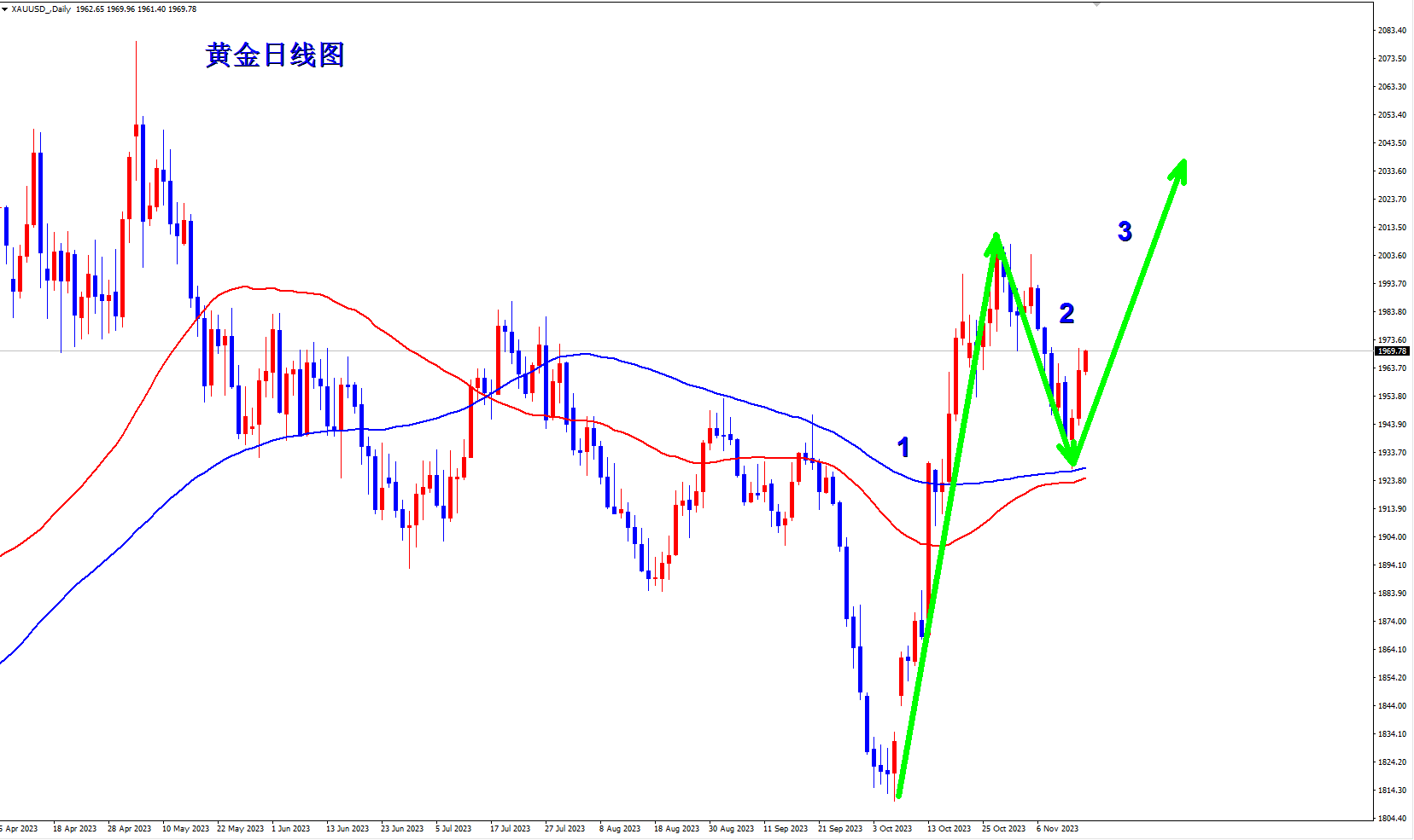 黄金日线上次从1810上涨至2009附近,属于第一浪上涨,现在日线二浪回调结束,接下来就是三浪上涨,黄金三浪上涨突破前期高点2009的概率很大,接下来我们就全力干多了,顺势日线三浪上涨。