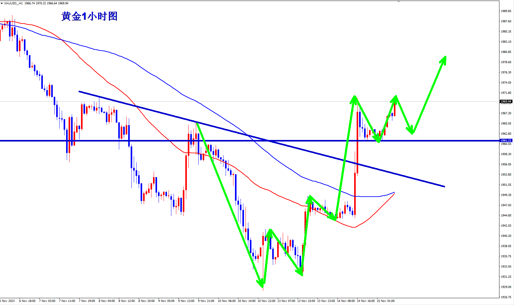 黄金1小时均线拐头向上,即将金叉向上排列,那么黄金多头空间打开,黄金多头大有可为,黄金1小时大涨突破之后全天运行在1960上方,黄金1960短线已经形成有效支撑,回落1960上都是给干多的机会,黄金回落1963附近可以继续干多。