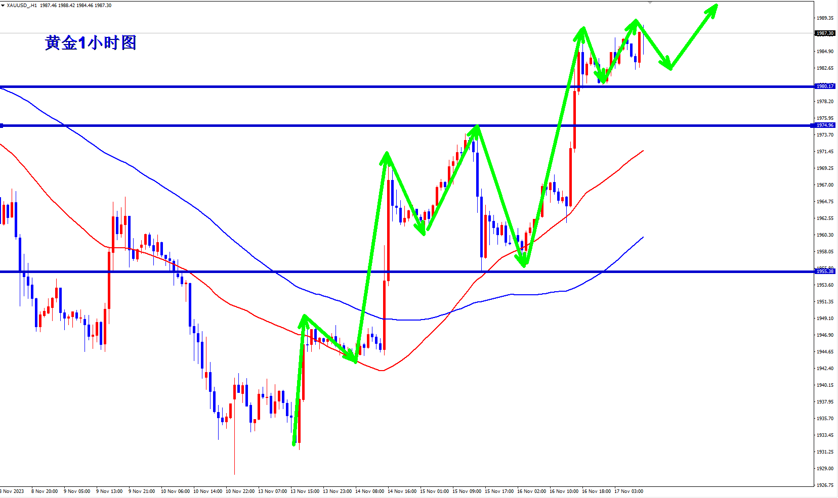 黄金距离2000只有一步之遥,1小时均线金叉向上多头排列,动能充足,今天能否一举拿下2000?我们拭目以待。黄金今天开盘之后一直在1980上方运行,说明黄金多头已经站稳了1980一线,现在回落不破1980都是给干多的机会。欧盘回落1980继续干多。