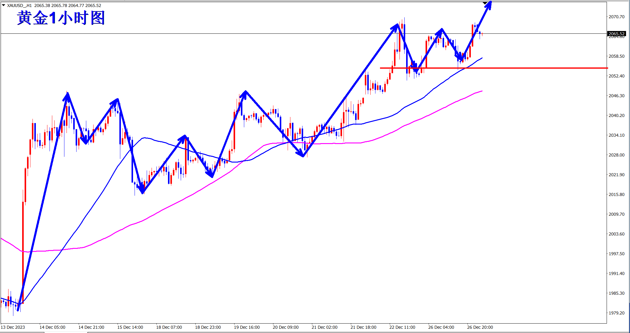 趋势上涨的行情,每次回踩都是再次干多的机会!当前黄金1小时级别上维持均线支撑上方运行!均线就是多空分界线,均线之上只多不空!继续将顺势的原则进行到底!