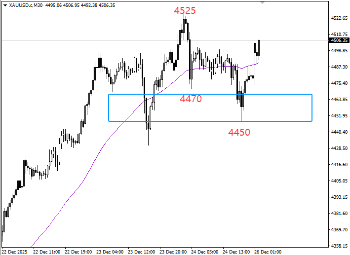 核心思路清晰明确:短线30分钟图上,第一支撑位看4470美元/盎司(国内金价1008元/克),第二支撑位看4450美元/盎司(国内金价1000元/克)。金价站稳4470美元/盎司上方即可坚定看涨,目标剑指4525美元/盎司(国内金价1020元/克)历史高点。
