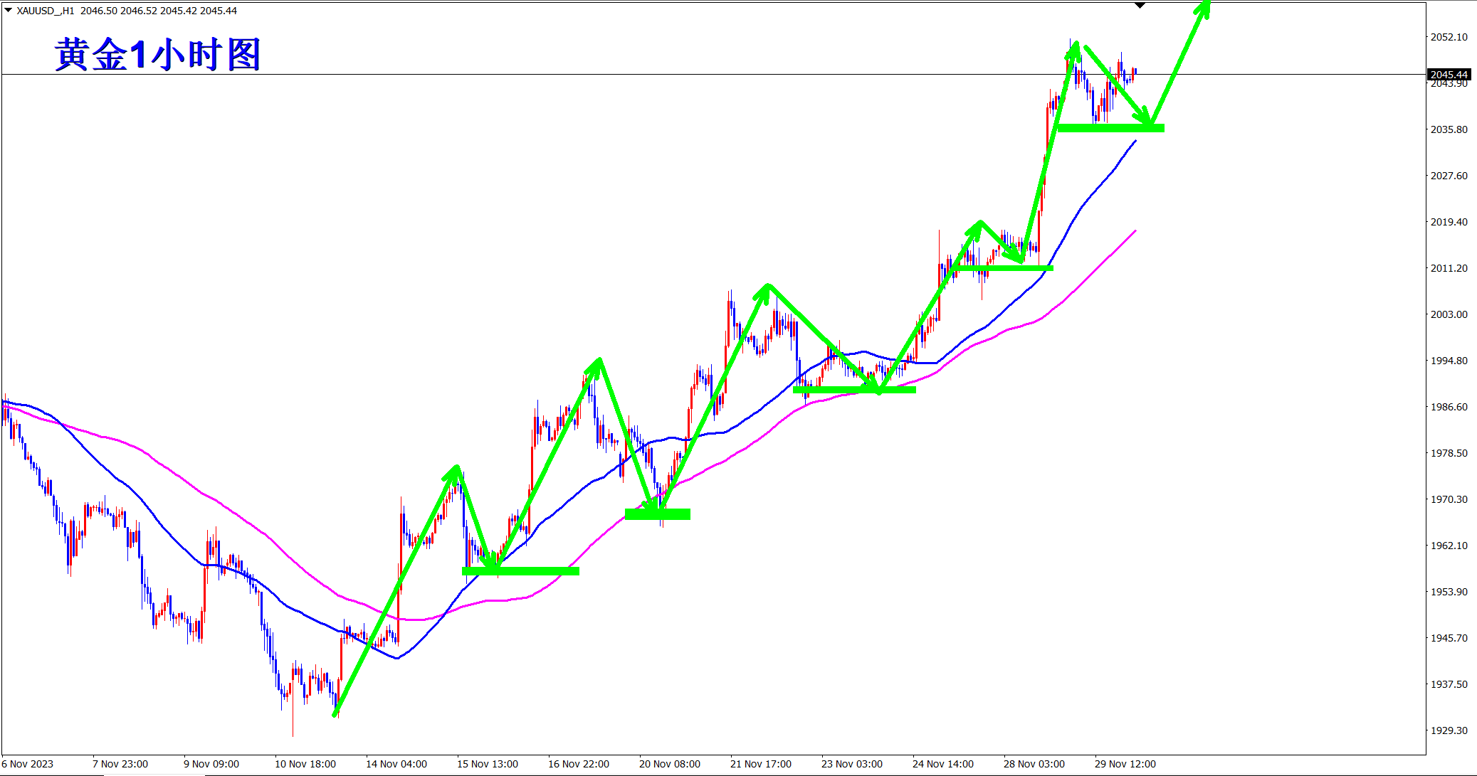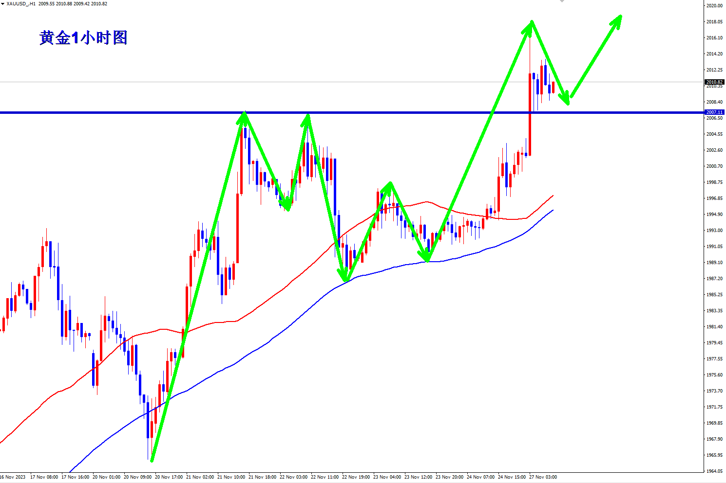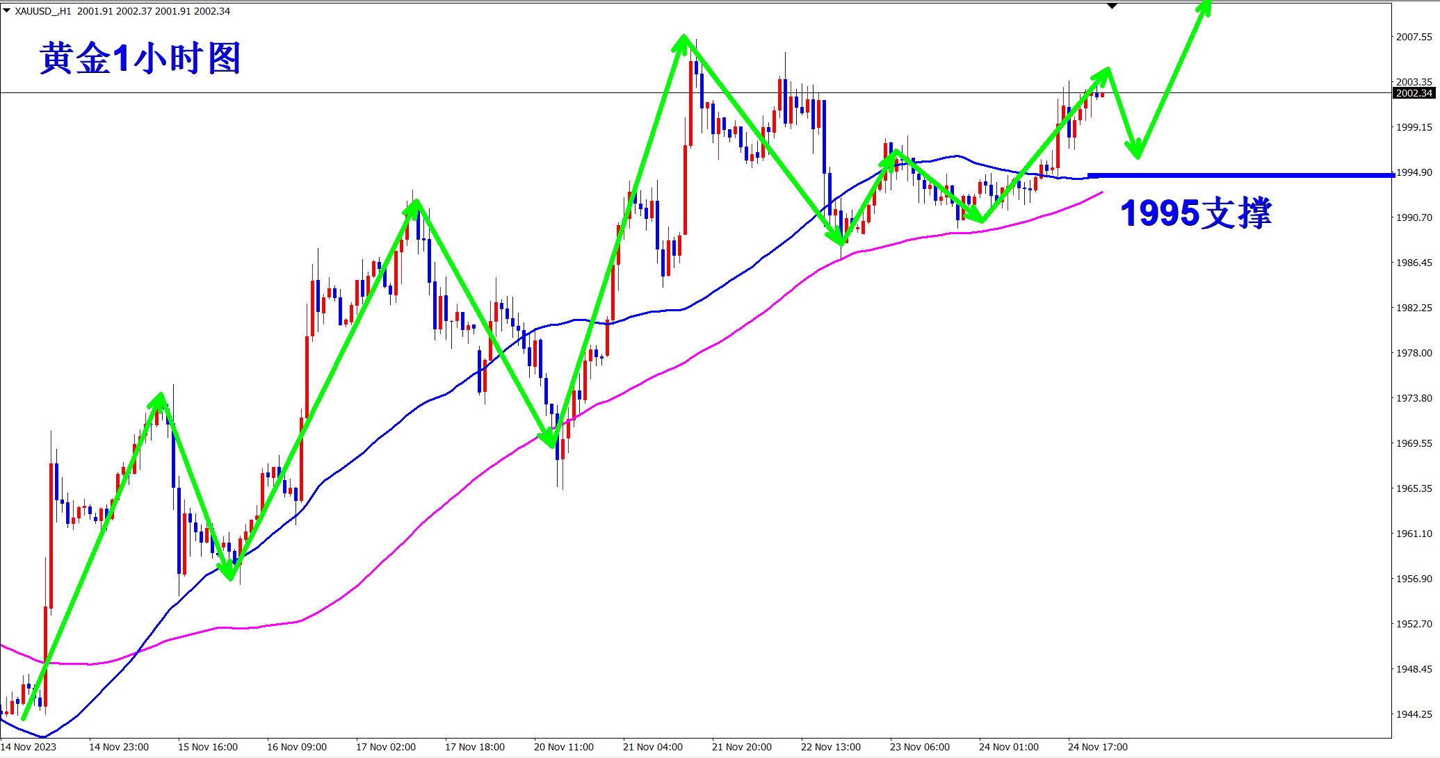 黄金当前依旧是强势的多头上涨走势,顺势轻飘飘,逆势乱糟糟,早盘黄金依托1995的支撑继续干多看涨!继续多! 黄金1小时级别走势上一直维持均线支撑上方运行!而且每次回踩均线支撑后都会强势拉起开启新的波段上涨!当前行情继续维持均线上方,还是多头上涨走势! 早盘黄金依托均线的支撑,也就是1995