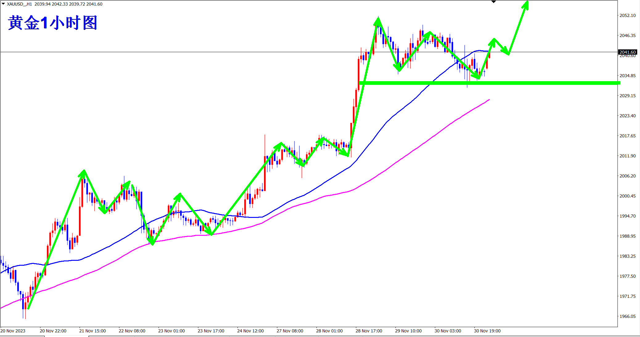 黄金昨日虽然回调,但还是站稳在均线支撑上方,多头上涨趋势没有改变!所以美盘王杨果断2033位置干多,如期大涨获利!当前上涨趋势没有结束,继续将顺势干多进行到底,早盘依托2033的支撑继续干多不变! 黄金1小时级别上看,当前的行情依旧维持在均线支撑上方,没有真正跌破均线支撑前,还是多头趋势!而且每次