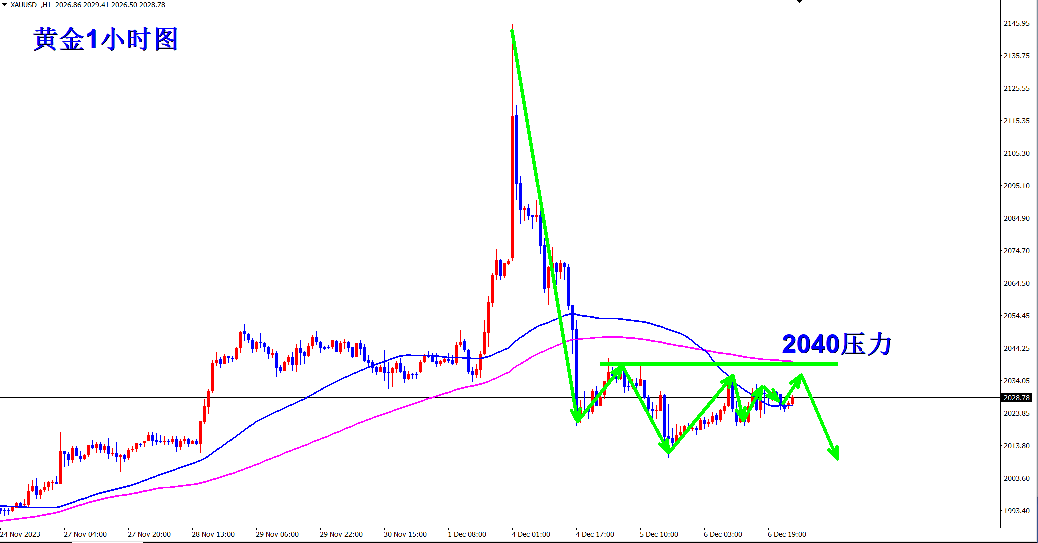 黄金昨日再次遇阻2040压力后下跌,王杨现价布局的2038空也如期大跌收割!当前黄金依旧是空头跌势,早盘2040压力继续干空! 黄金当前明显的下跌空头走势,1小时级别上,黄金也一直维持在均线下方,而且每次反弹遇阻2040后都再次大跌!这也是多头反弹难以逾越的高点压力,早盘反弹遇阻此位置后还是继续干空!