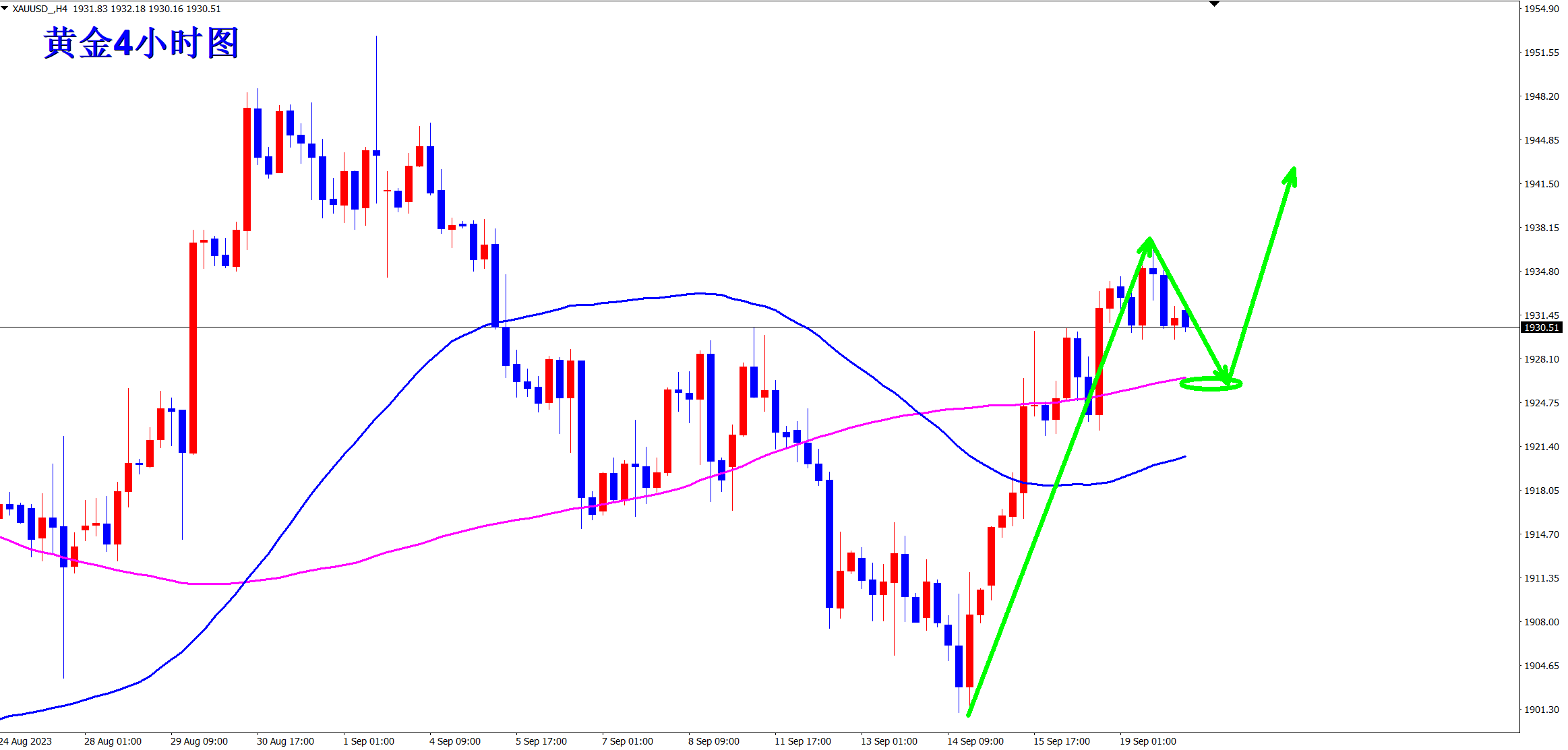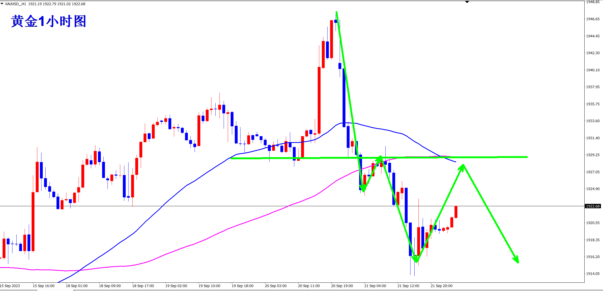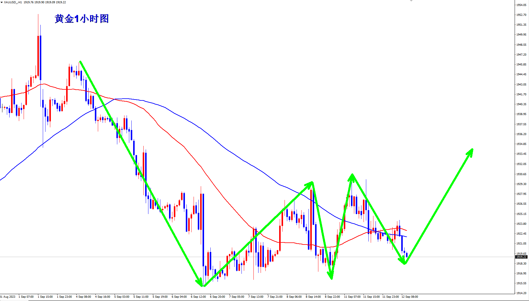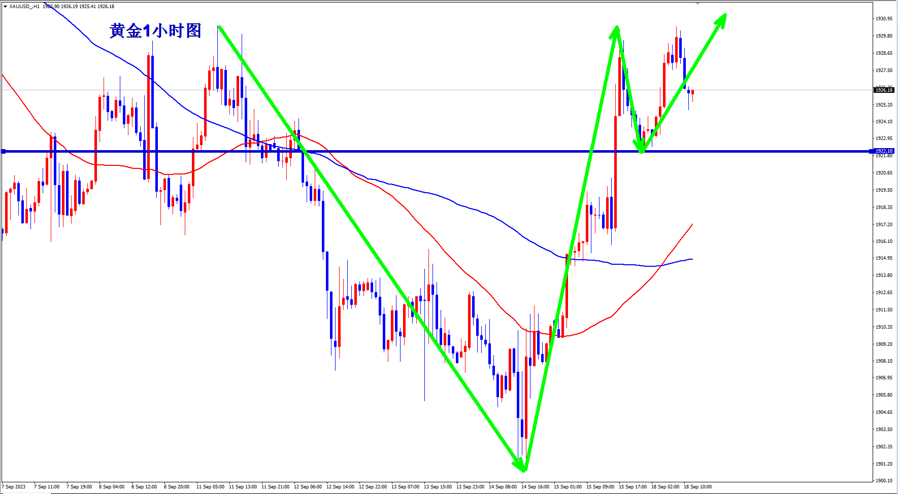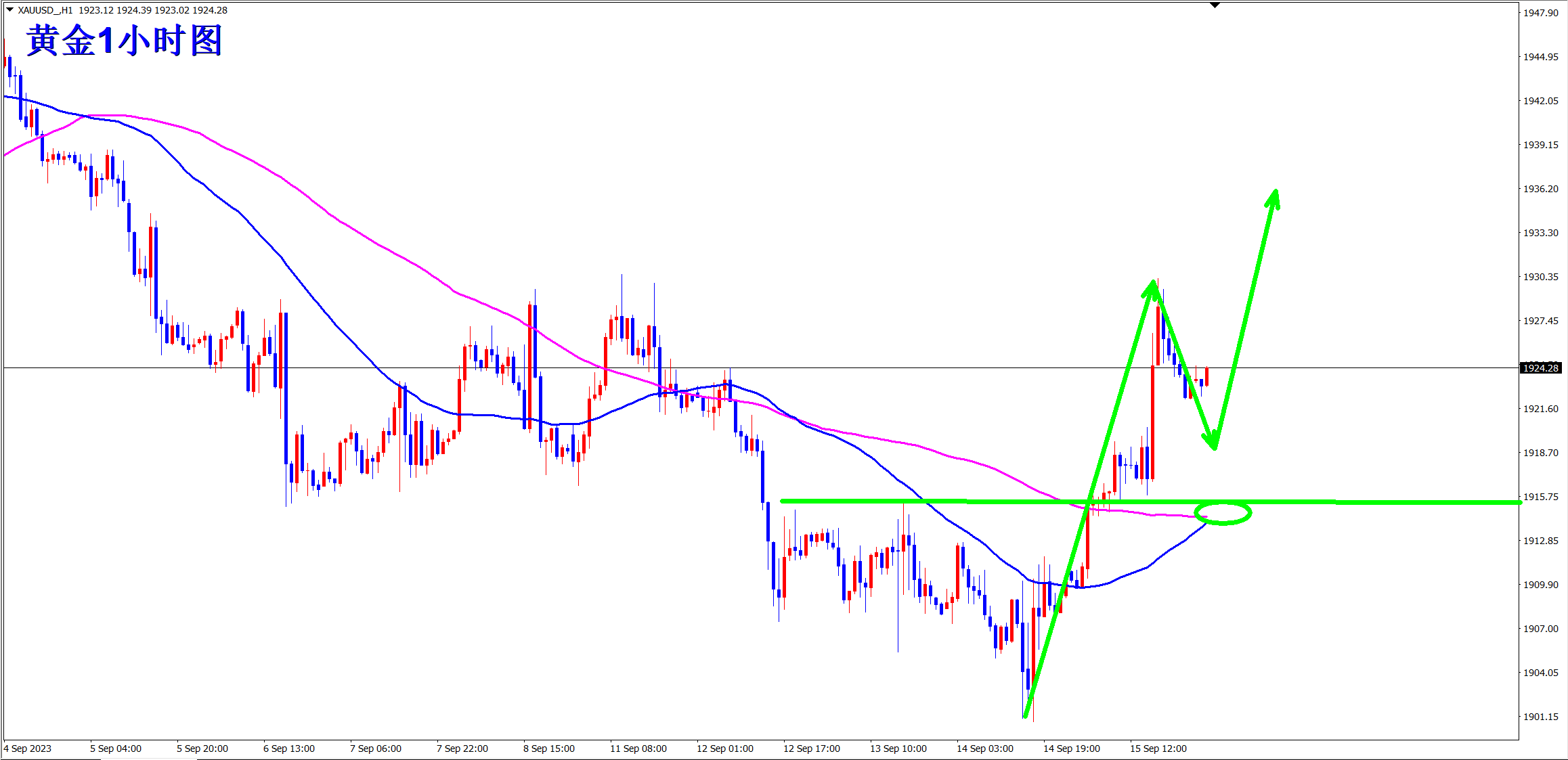 这两天黄金又到了考验耐心的时候了,行情节奏比较慢,而且波动上下也就十来美金。又是大行情酝酿前暴风雨前的宁静。既然行情也跌不下去,那黄金午后现价直接多! 黄金现在上下两难,不过1小时均线现在是金叉排列,1小时已经多重底部结构,而且基本上没有破位新低,黄金只要没有跌破1915新低,那么就还是短线筑底阶
