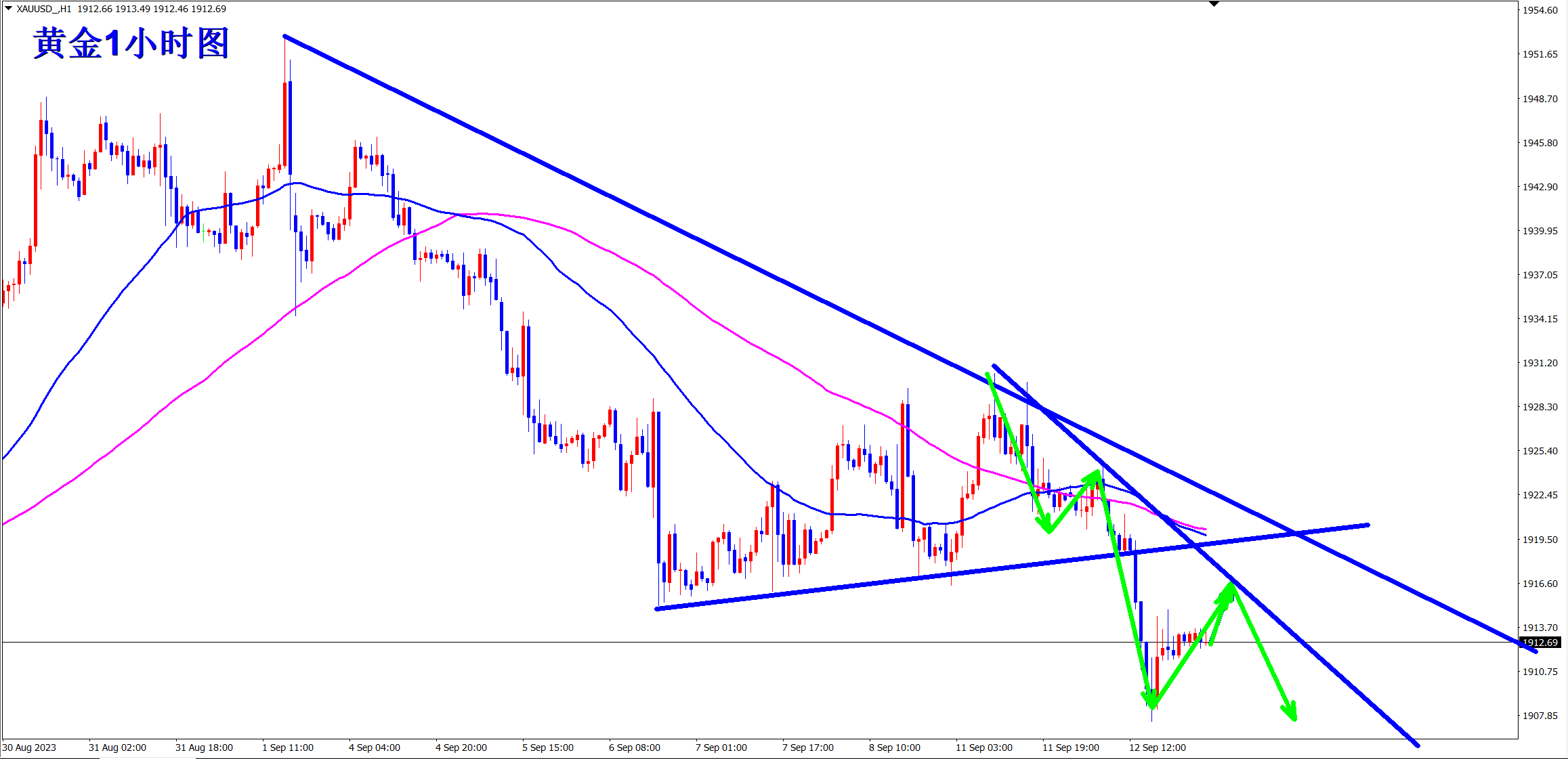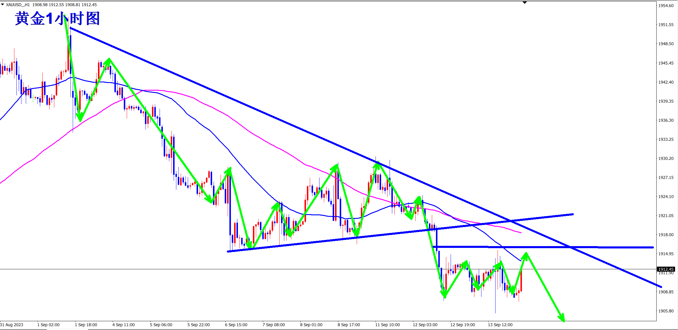 黄金当前趋势下跌延续,早盘依托1916压力位置继续干空,看跌! 黄金从1小时级别走势上看,继续的震荡下行,虽然当前在1910上下震荡,但是上方的压力非常明显!昨日尝试了一天都没有突破!当前k线依旧受到均线的压制!久盘必跌!所以今日依托昨日的1916压力继续干空! 顺势轻飘飘,逆势乱糟糟!除非行情强势突
