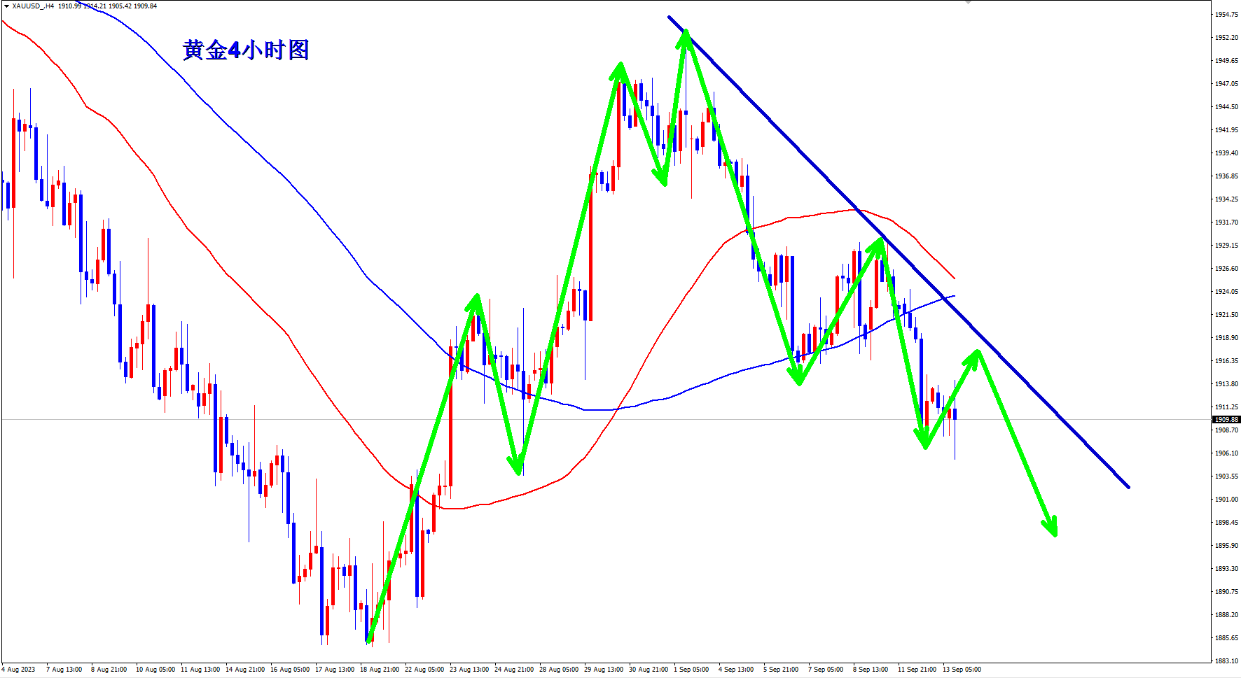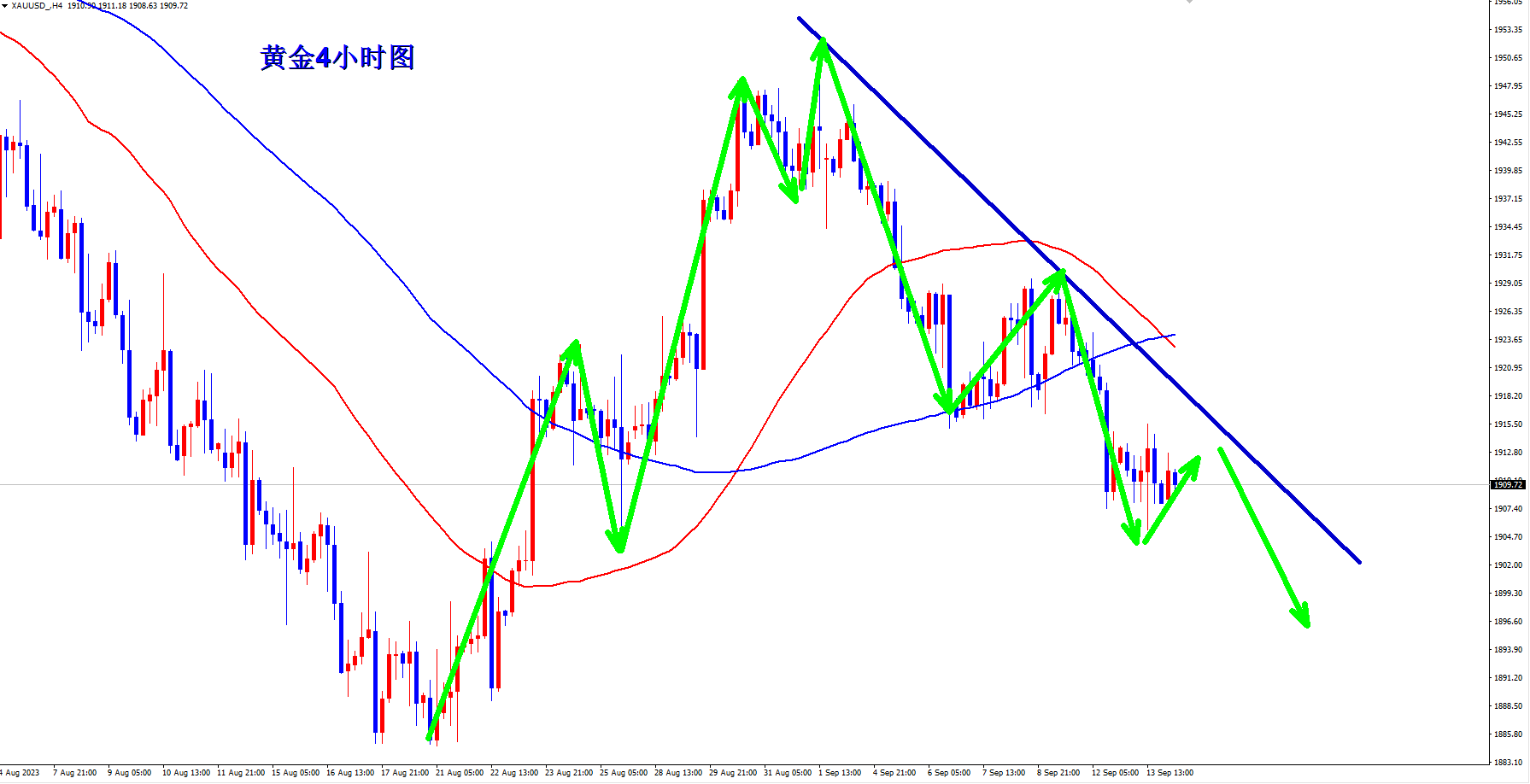 黄金反弹没有突破关键压力,还是空头跌势,反弹依旧是干空机会,早盘1915干空! 黄金4小时级别上依旧是空头下跌,当前的反弹是下跌过程中的正常修复!虽然昨日强势反抽,但依旧没有突破最关键压力,也就是最近的盘整1915位置!这一位置也是下跌趋势线的压制位置! 趋势为王,顺势而为!行情演进的过程