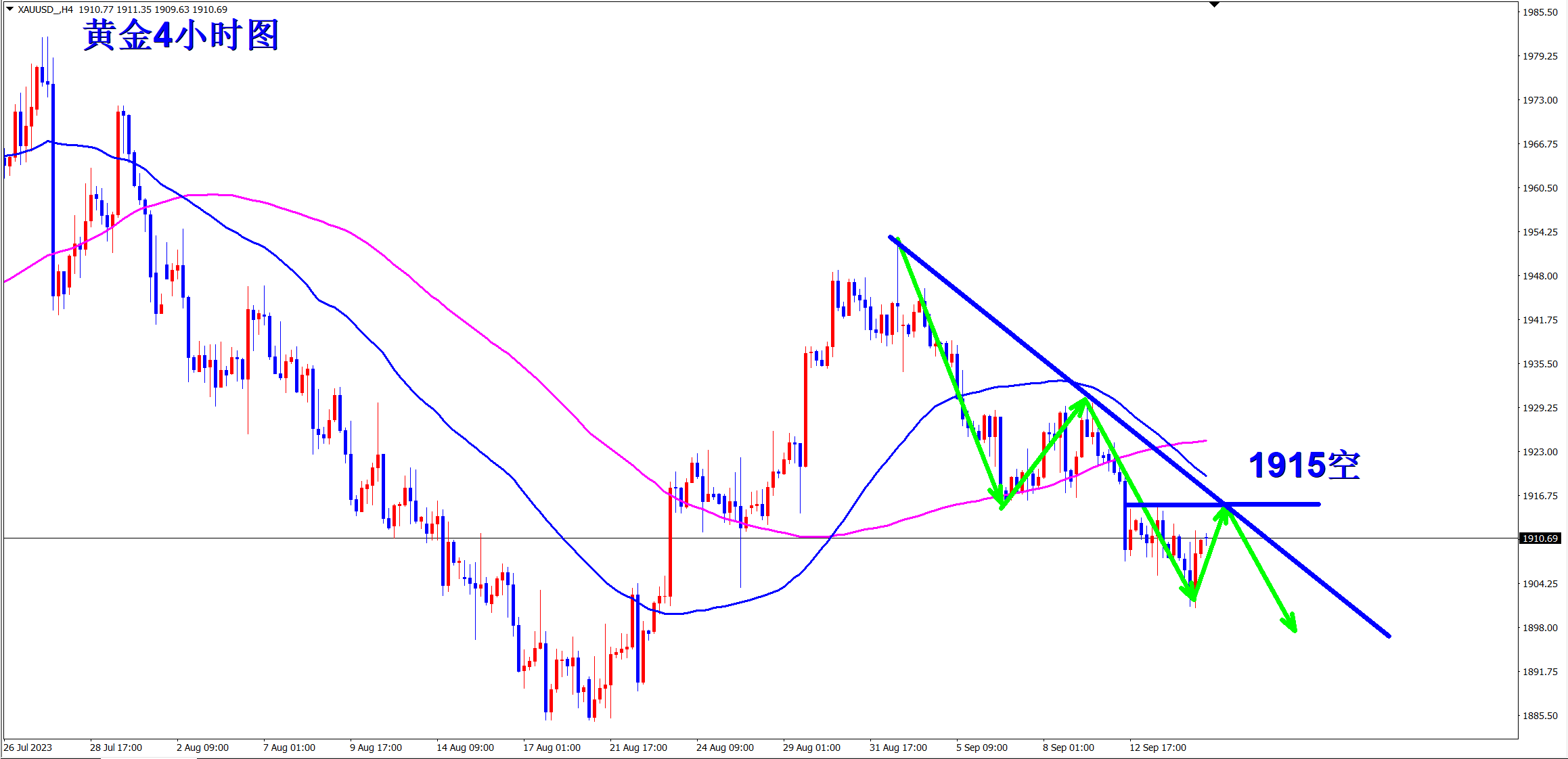 昨日CI行情有点令人意外,没有什么行情,辜负了很多人的期待,黄金现在横盘弱势震荡,又是暴风雨前的宁静,真正的勇士敢直面惨淡的行情,敢于亮剑,勇者无畏,从来不模棱两可。早盘现价1910直接先空了。 黄金4小时均线已经死叉空头排列,空头开始弱势,4小时也一直受下行趋势线压制,昨日黄金美盘多次上冲未果,一