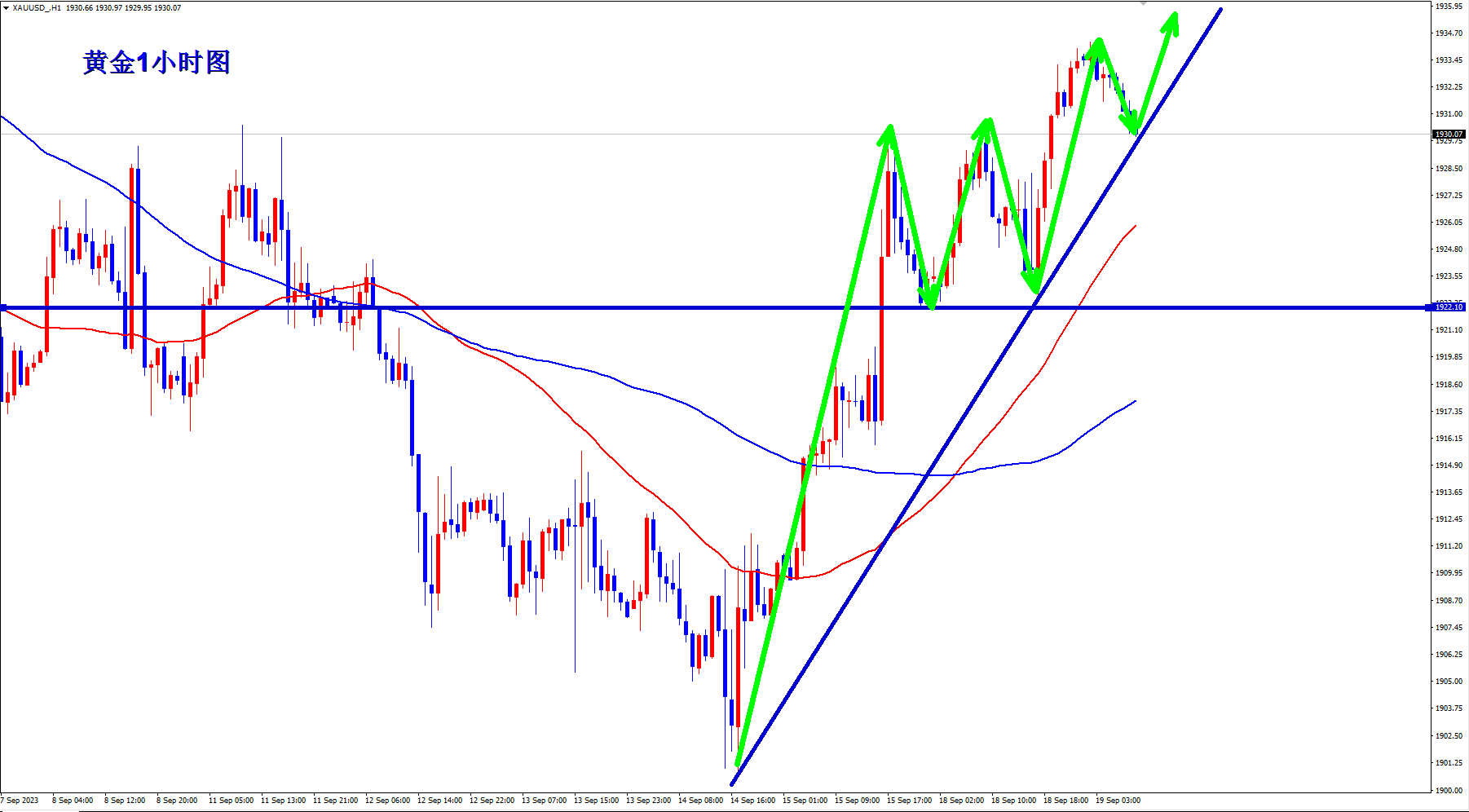 黄金昨日1925现价提示干多,美盘如期拉升上涨,多单收割!开门红!当前黄金还是多头,早盘1925的支撑继续干多! 顺势轻飘飘,逆势乱糟糟!方向对了不怕路远,最近行情波动有限,操作上保持耐心!当前黄金1小时级别上震荡上扬,每次回落都是干多机会!当前低点连线和均线的支撑落在1925一线! 多,早盘