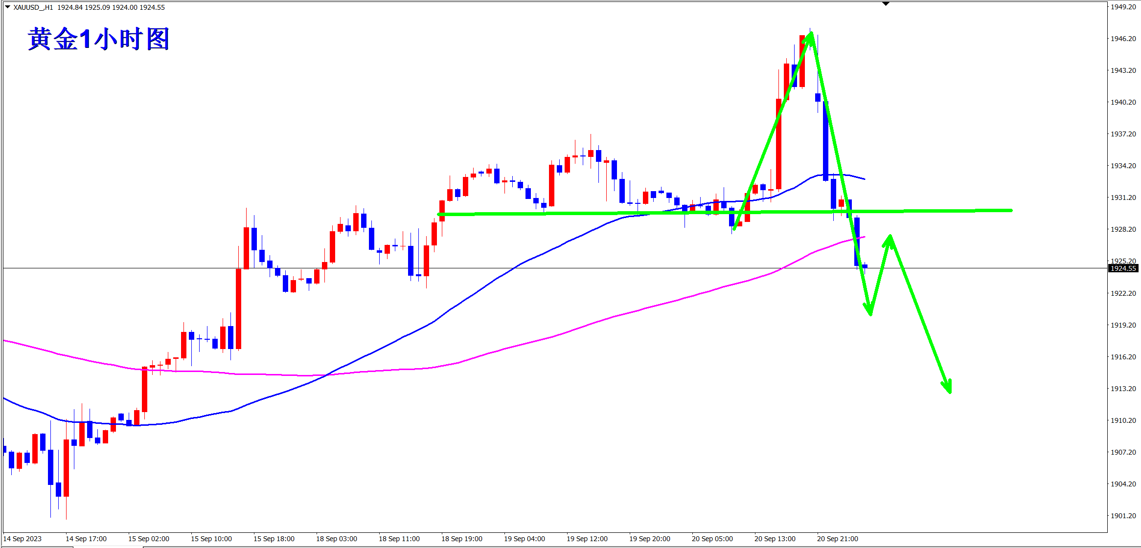 凌晨美联储利率决议已经公布,鲍威尔继续维持鹰派,黄金应声下跌!此前我们一路做多看涨,美联储利率决议后,黄金后半夜冲高回落,我们也要及时的调整思路,开始干空!早盘依托1932压力干空! 黄金当前出现尖顶形态,并且大阴线直接捅破此前1930的支撑!空头非常强势,趋势直接转变,顺势而为,及时跟进!此前