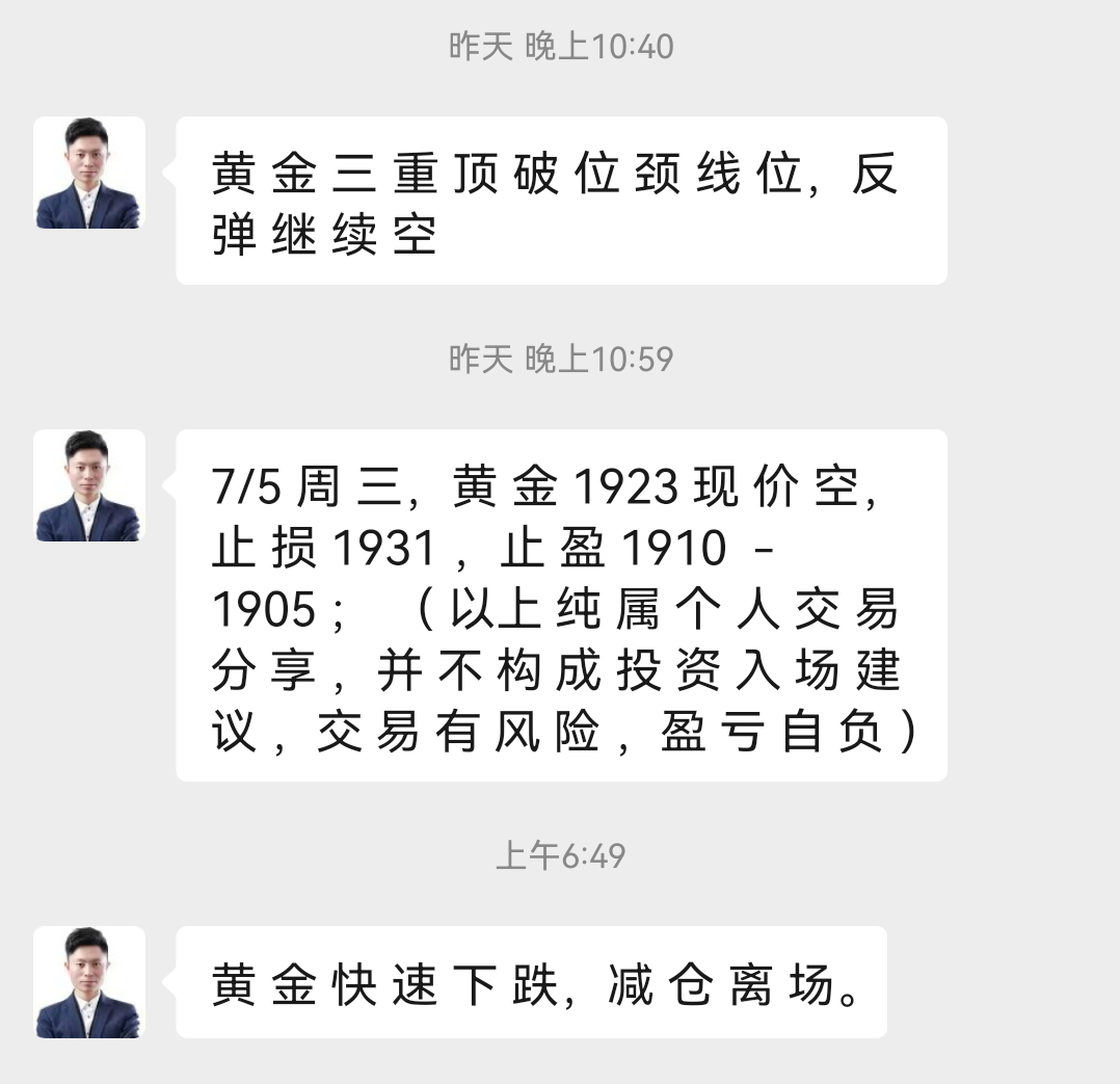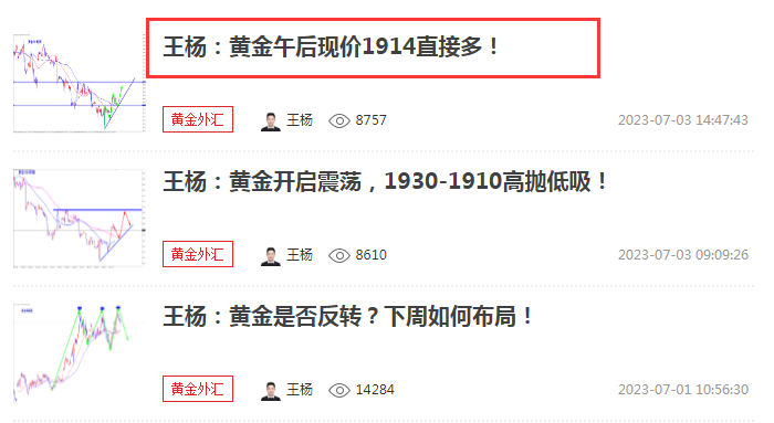 昨日王杨早盘就提示了,黄金震荡,高抛低吸!靠近1910就做多,触及1930就干空!怎么样?走势是不是完全就是按照剧本运行的!计划你的交易,交易你的计划,仅此而已!剩下的就是收割! 当前的黄金明显的开启了反弹段,此前我们一路高空,但现在趋势发生反转,王杨也是第一时间转多看涨!趋势为王,顺势而为!我
