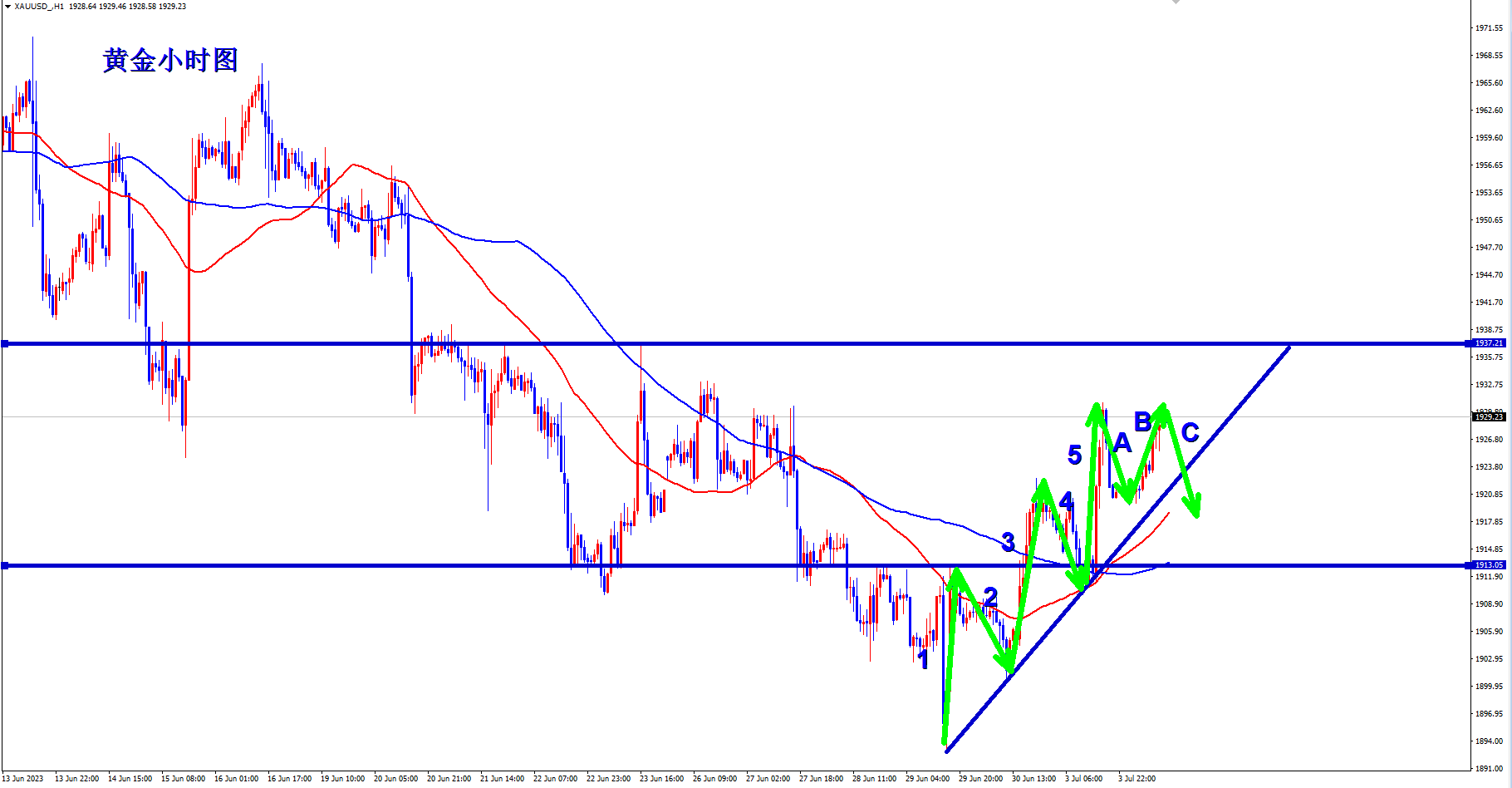 黄金反弹了,是否又转多了?答案是否定的,反弹就是给干空更好的机会。黄金午后现价1928直接空! 黄金短线受1920附近支撑开始反弹,现在刚好反弹到1928附近,也就是前面1小时上行趋势线跌破之后形成的反压位。前面我说过黄金1小时经过小五浪上涨之后开始了ABC的一个调整。调整刚好跌破了1小时的上涨趋势线。现在黄