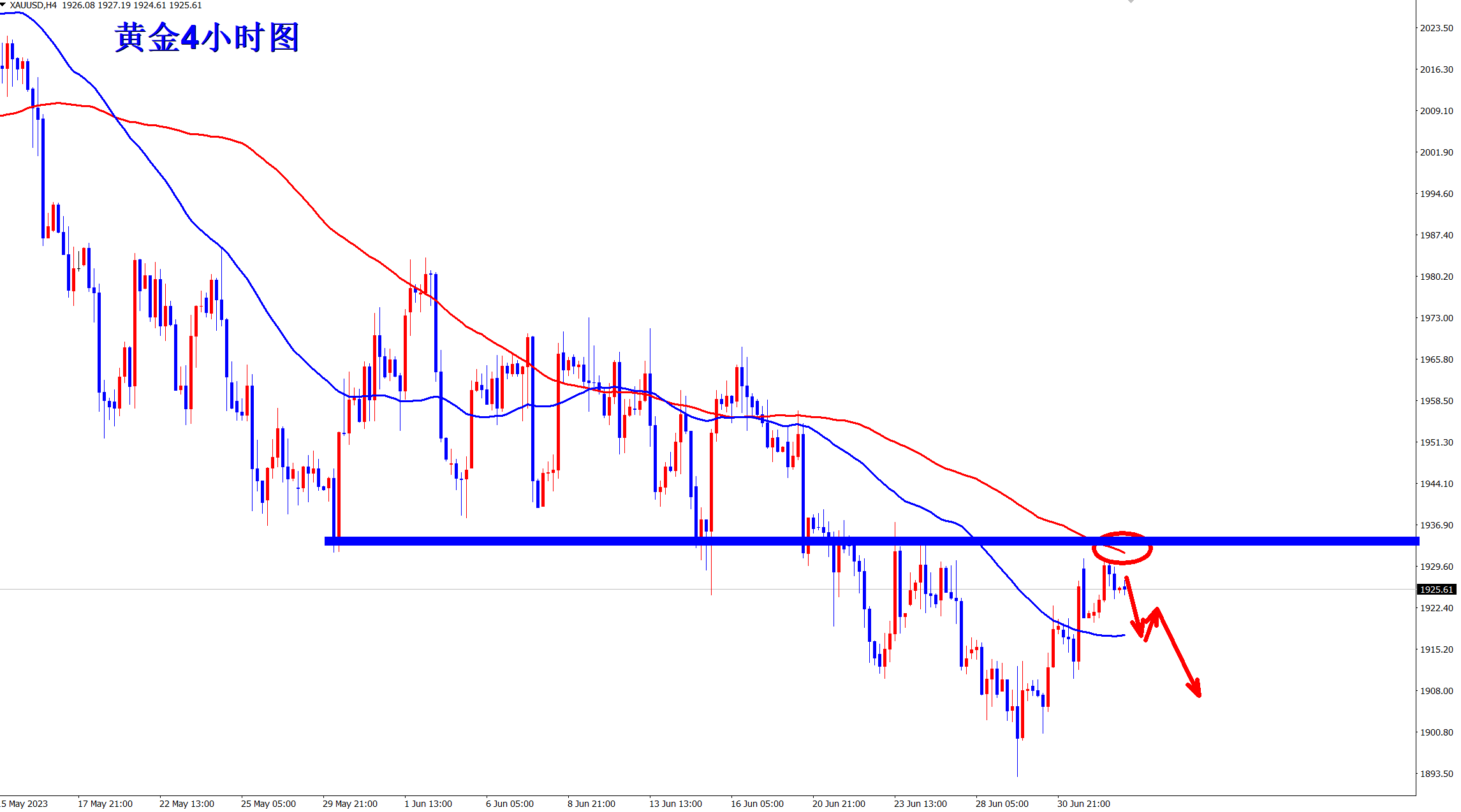 黄金当前的反弹已经到位,接下来将会继续下跌,早盘1930直接干空,看跌! 黄金4小时级别上可以看出,本次的反弹触及长期均线的压制后,遇阻回调!1935压力没有突破前,黄金就还是空头走势不变!昨日行情再次上涨,但是未能突破新高,说明本次反弹已经结束! 空,早盘依托1935的压力干空,1930附近即可直接空!