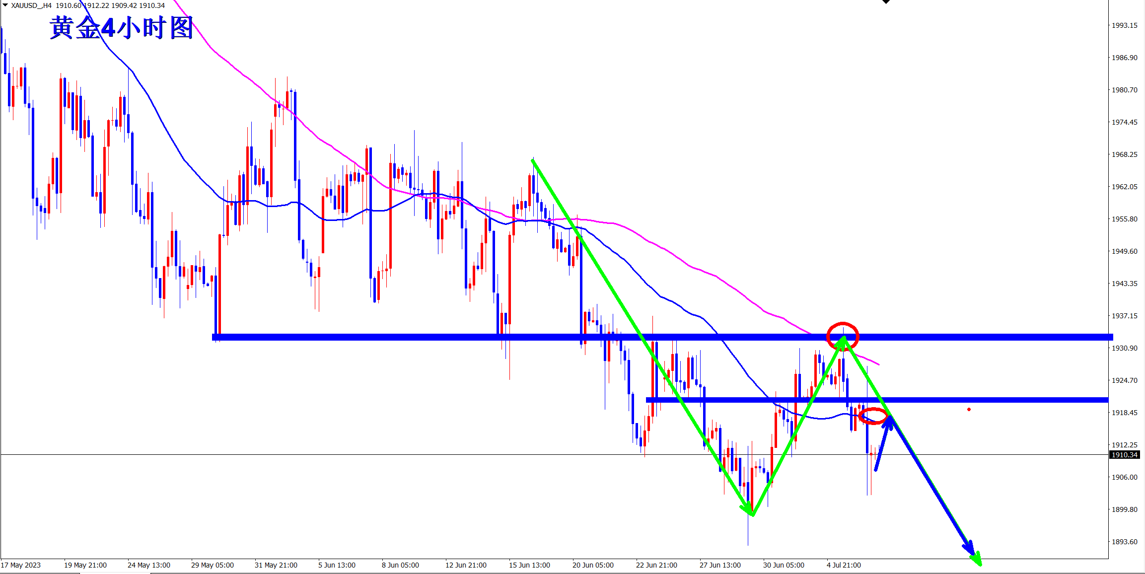 黄金昨日小非农暴跌,今日大非农,跌势继续,早盘压力位置继续干空,1918压力空! 黄金当前反弹结束,重启下跌!从4小时级别上看,本次反弹触及长期均线的压制后直接拐头向下,并且直接跌穿短期均线的支撑!当前K线维持在均线下方,空头跌势!反弹都是干空机会! 当前的压力是昨日盘整的反向压力位置,也是短