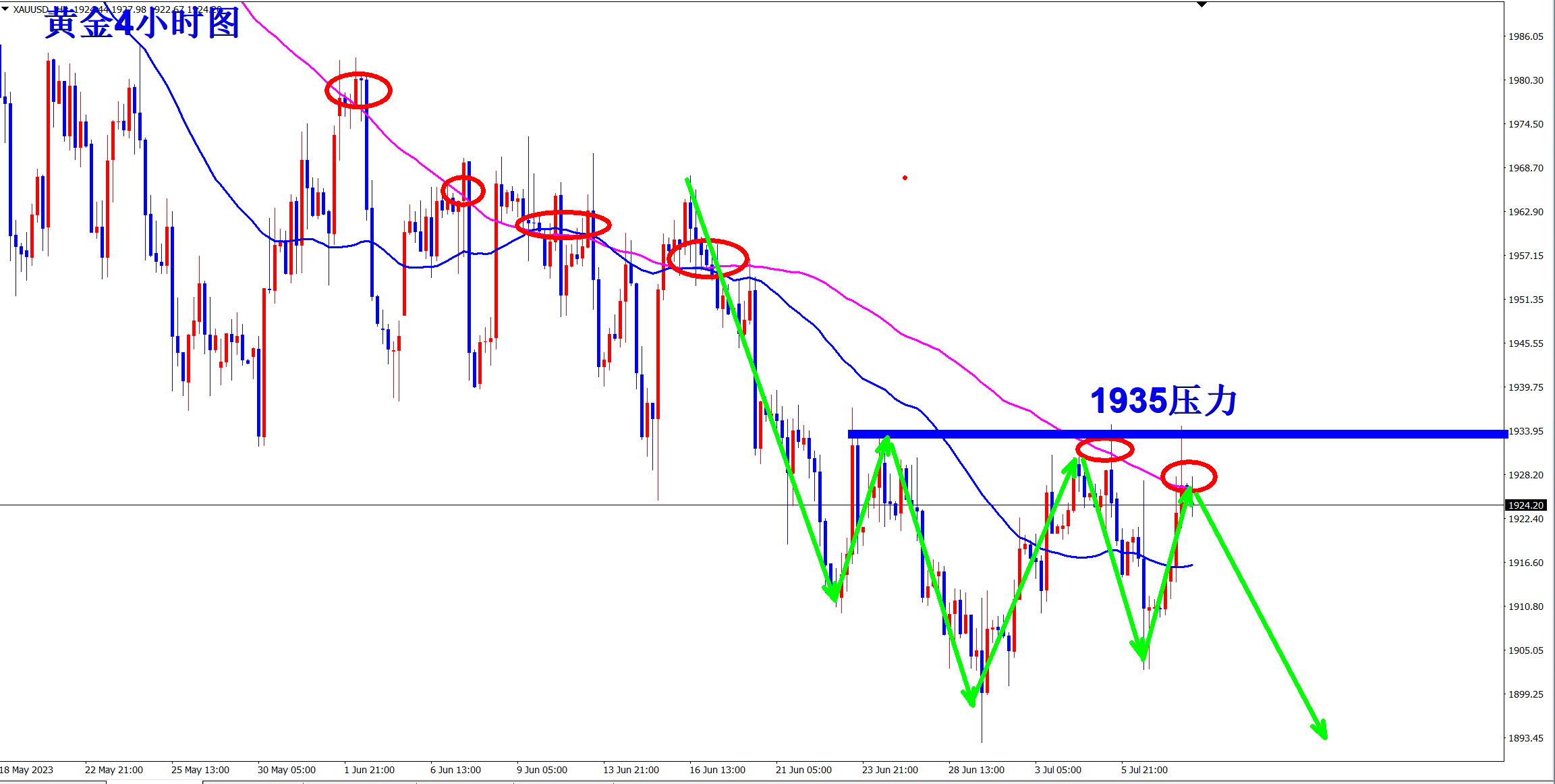 黄金周五大非农利多反弹,但是没有突破关键压力1935,还是空头下跌走势,早盘依托压力位置继续干空,看跌! 黄金虽然当前进行震荡反弹,但是一直没有突破4小时长期均线的压制!此前黄金也有过刺穿均线的形态,但最终都没有站稳,而是继续重归跌势!现在的走势也是如此,周五刺穿后快速回落,压力依旧! 早盘依
