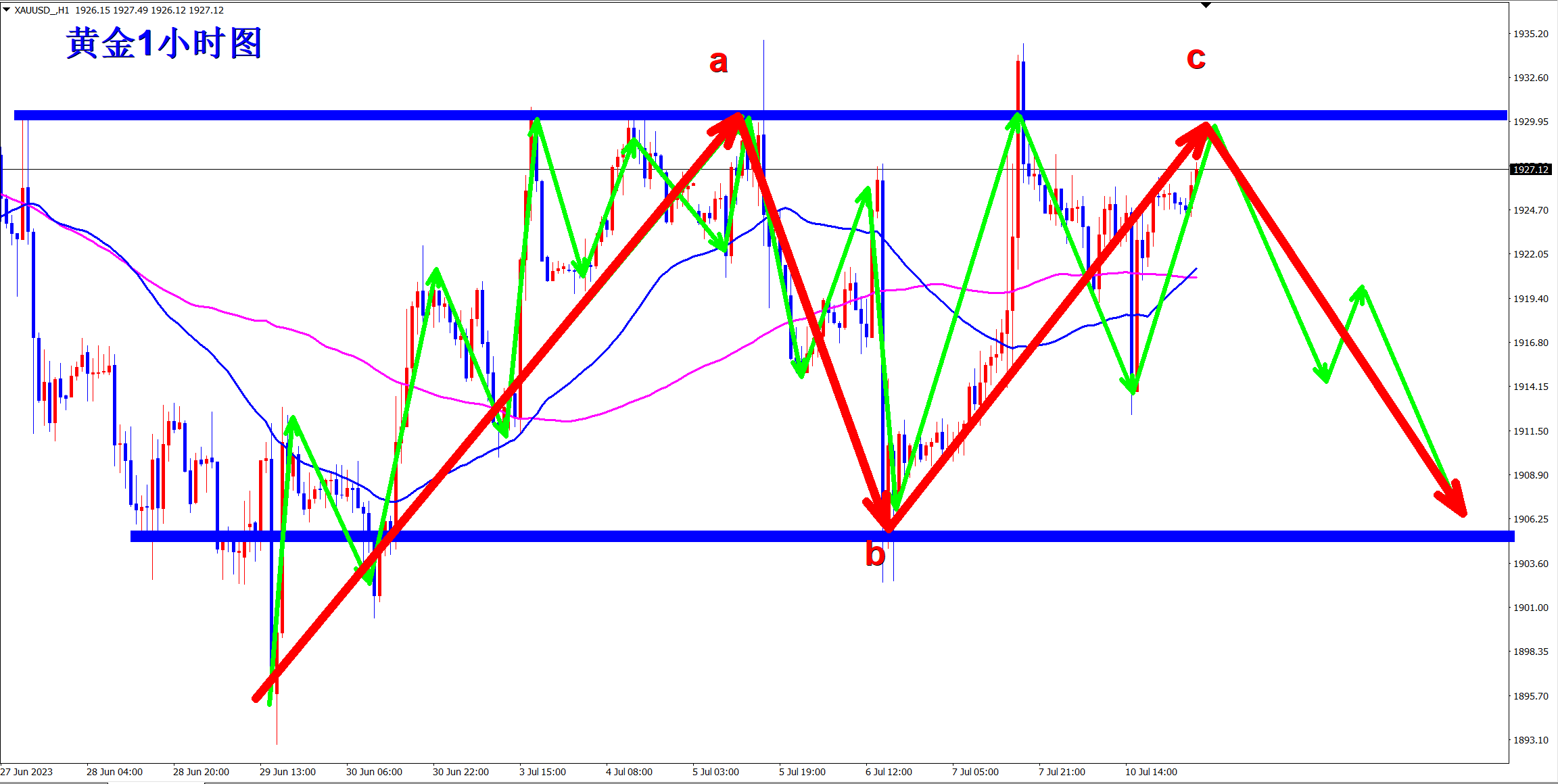 黄金当前继续进行调整震荡,已经靠近压力,早盘依托1935的压力干空,波段下跌即将重新开启! 黄金本是下跌格局,当前获得支撑后进行调整震荡,从小时级别上看,现在已经进行了abc浪的反弹,调整接近尾声,随时可以再次开启新的下跌波段!所以遇阻后要直接干空! 黄金日线上依旧是空头下跌格局,没有拐头迹象,