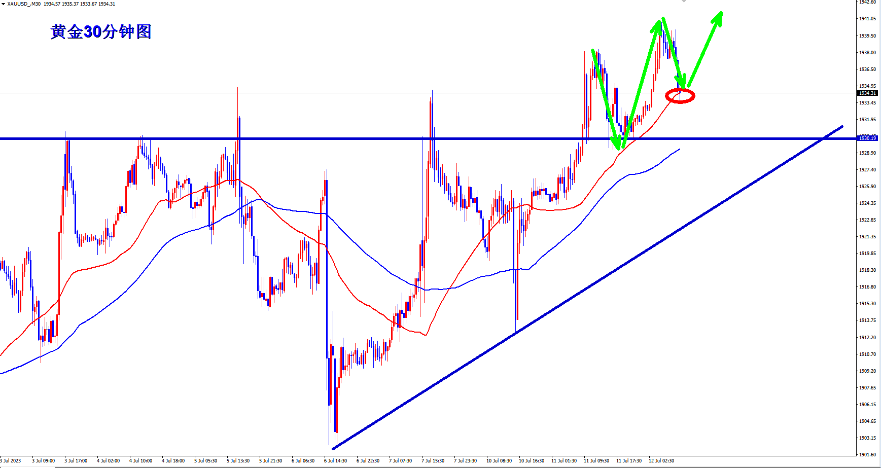 黄金午后现价1934直接干多! 黄金昨日突破1935高点之后今日高位震荡上涨,均线多头排列,黄金30分钟上涨趋势线短线支撑黄金继续上行,均线支撑1934附近,上行趋势线支撑在1930附近,也刚好和昨日黄金突破之后下探的低点重合,午后1934直接现价干多! 行情是干出来的,不是看出来的,机会来了,直接就是干,不