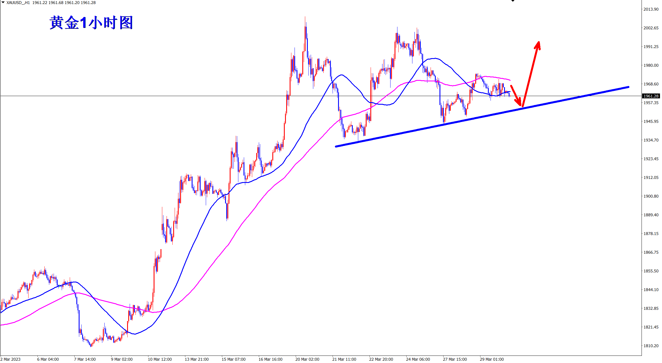 黄金当前区间震荡,但大方向还是多头!回落支撑位置依旧时低多看涨,早盘依托1950支撑多! 震荡行情,保持耐心!方向对了不怕路远!计划你的交易,交易你的计划!当前的黄金走势很清晰,趋势上涨,震荡修正,为再次上涨蓄势!1小时图上可以看到,低点连线形成趋势支撑线,此连线上都是多头机会! 早盘行情回踩