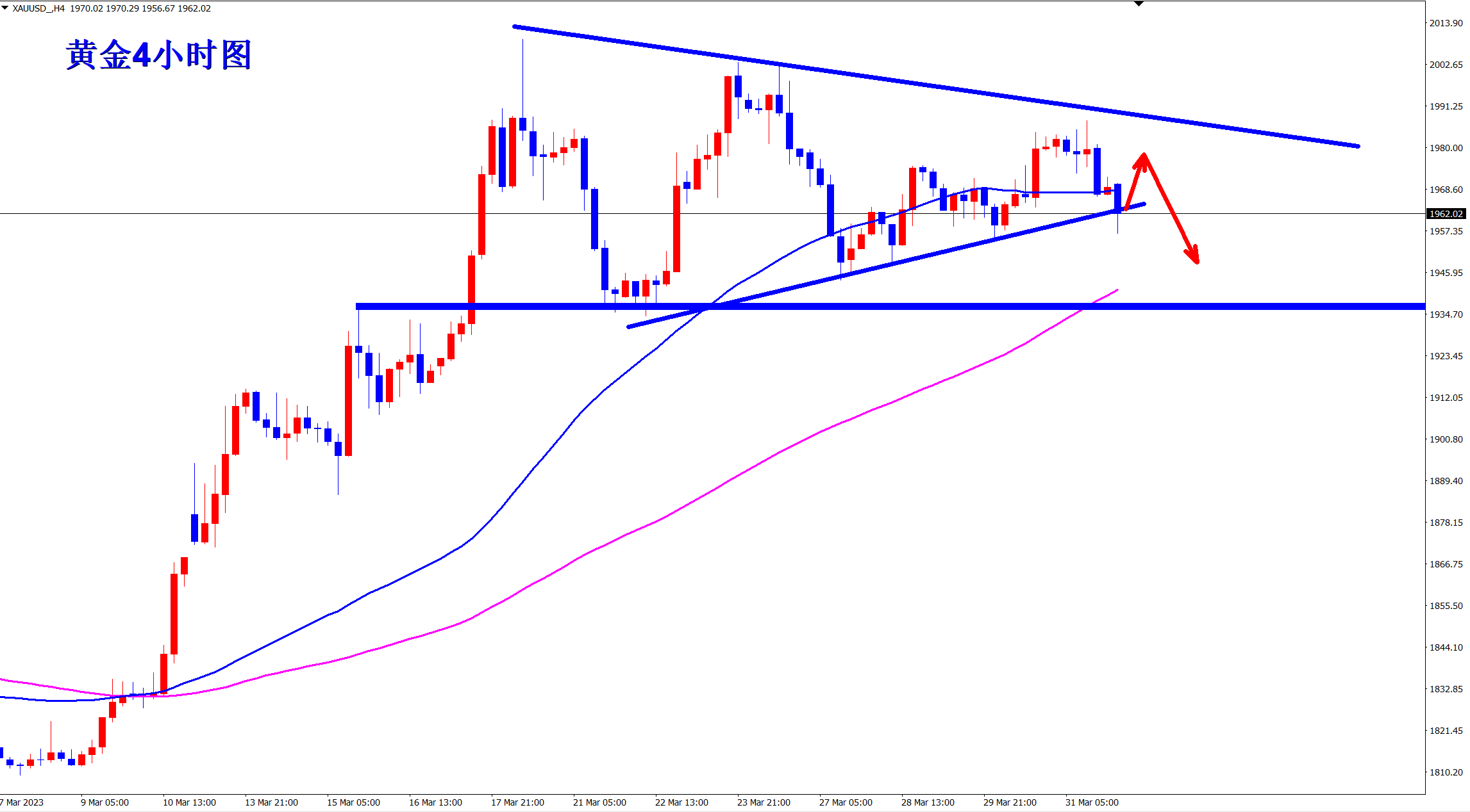 黄金周五上涨无力后行情转跌,我们及时调整思路,1980直接干空,最终如期下跌,收割! 今日黄金开盘后直接下跌,跌势延续!早盘反弹依托压力位置继续干空,上方的压力是1970位置,早盘反弹触及此位置后直接空,下方支撑关注1950! 震荡行情,点位致胜!当前的黄金暂时维持4小时级别上的三角形内部整理!没有真