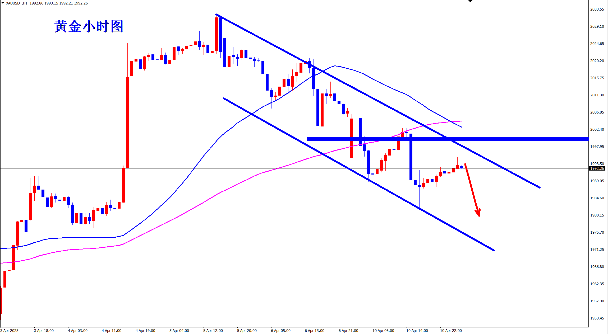 黄金昨日震荡下跌,王杨多次出手干空,满载而归!今日黄金还是继续干空不变,依托2000压力就是干!一个字:空! 黄金当前很明显的趋势下跌,尤其是1小时级别走势上可以明显看到,震荡下跌的趋势行情,而且高点连线和低点连线形成了通道,行情暂时维持通道内逐步下行,重心下移! 当前的黄金k线已经跌至均线下