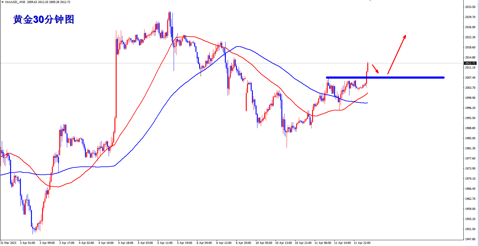 黄金一直受到压制,早盘直接拉升,突破站稳了2010,调整思路,今天回落做多为主。这就是市场,上一秒跟下一秒的行情就可能直接改变走势,王杨从来不做死多头也不做死空头,势变则随,方向错了,反手跟进就是利润。 黄金早盘直接突破,30分钟均线开始拉升金叉向上发散。行情昨天憋了一天,来回震荡,最终选择了向上