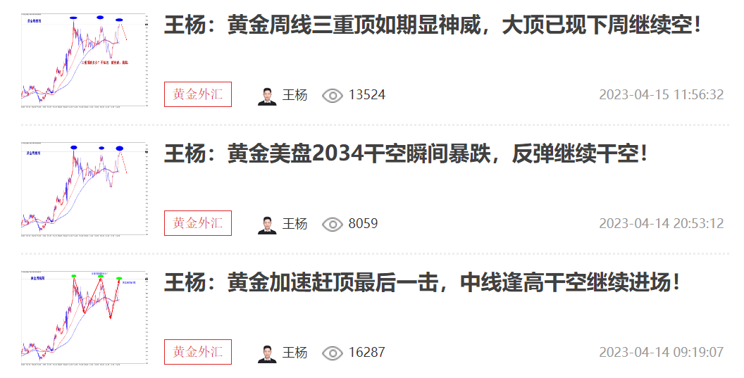 黄金周五王杨提示波段大顶机会来临,并且提示波段干空!跟上的能有几人?事实胜于雄辩!当前黄金已经走出月线三顶结构,干空,早盘2010压力继续空! 黄金周五冲高回落,明显的赶顶行情,而且直线暴跌,重回此前的盘整区域内!飞流直下三千尺,没有止跌信号!顺势而为,一直是王杨所强调的,现在行情已经开启空
