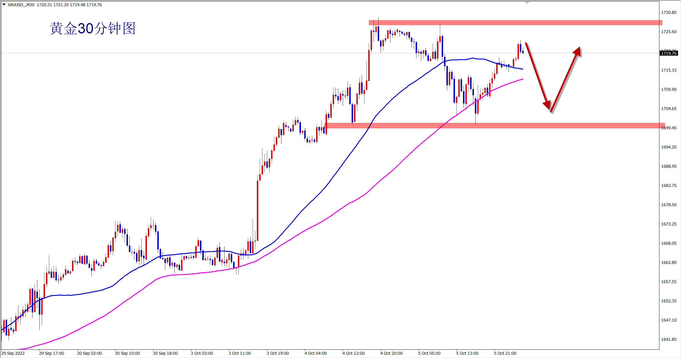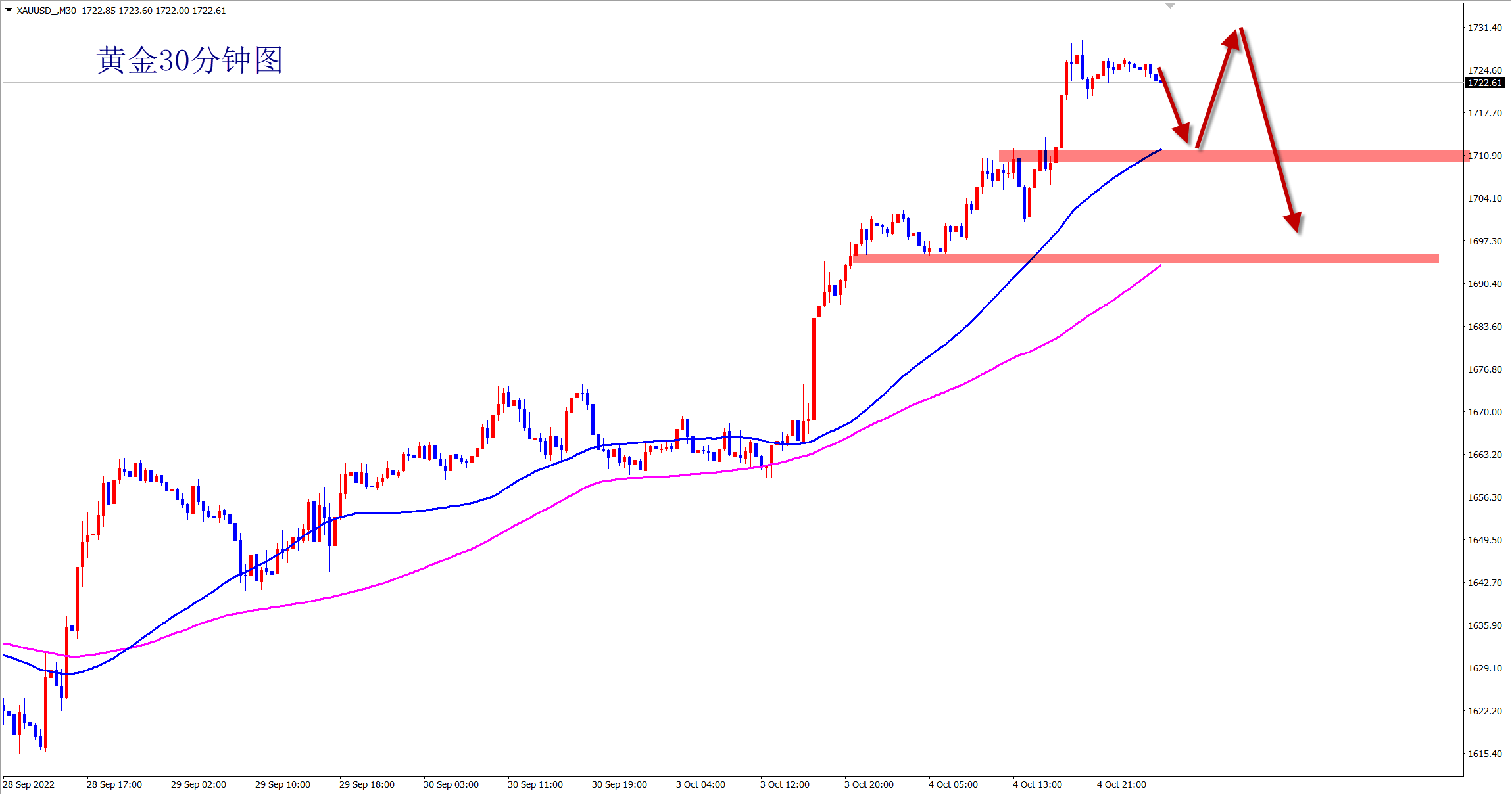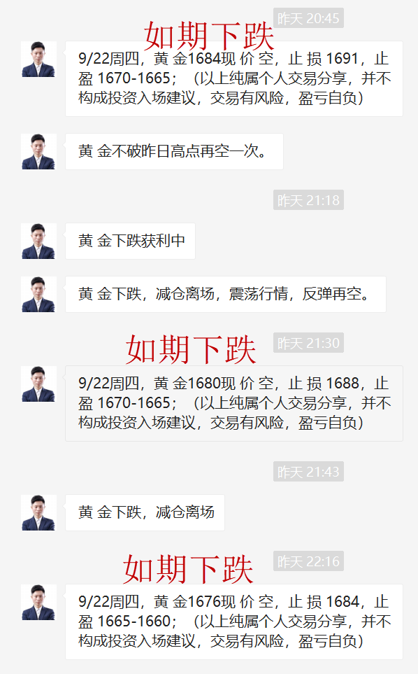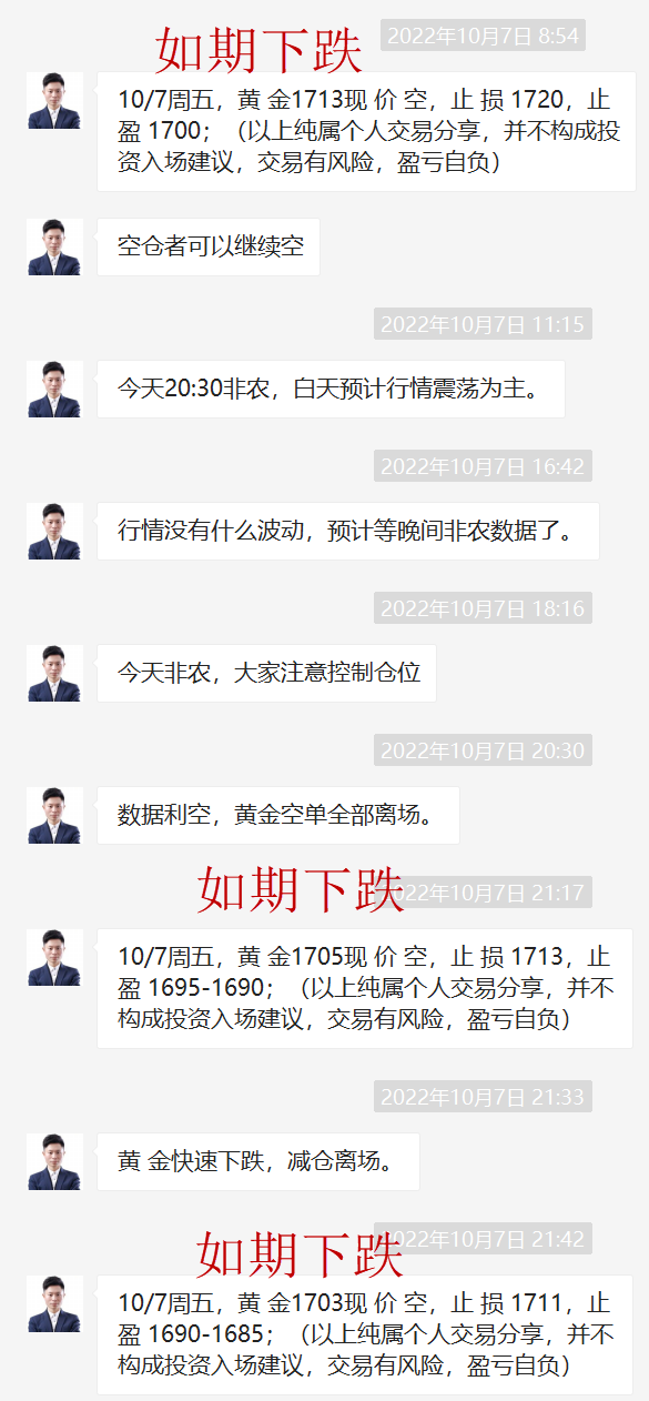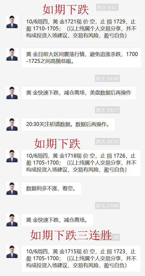 黄金周五行情震荡后下跌,王杨更是在1713位置开始干空,然后1705干空,1703干空,全部如期大跌收割!当前行情转跌,早盘依托1705的压力继续干空! 黄金三次冲击1730的压力都未能突破,周五非农数据利空,更是直接破位下跌!随后的反抽未能重新进入到此前的震荡区间内,破位有效,行情转跌!接下来开始高空看跌