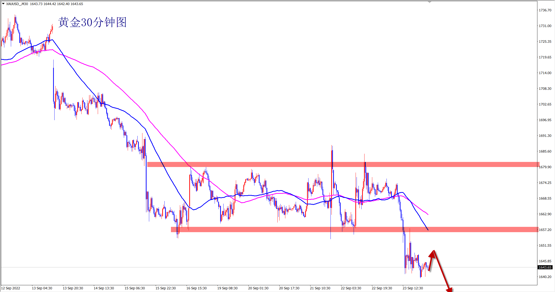 黄金早盘再次破位下跌,虽然快速拉起,但还是空头跌势不变,反弹仍是干空机会,依托1658的压力继续空! 黄金当前明显的下跌走势!这一点是毫无疑问的,而且下跌的幅度和力度都非常强势!新低不断,趋势为王,顺势而为! 空,早盘1658压力下反弹就是继续干空!下看1600! 早盘操作思路 黄金1645