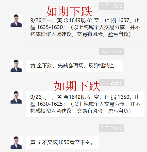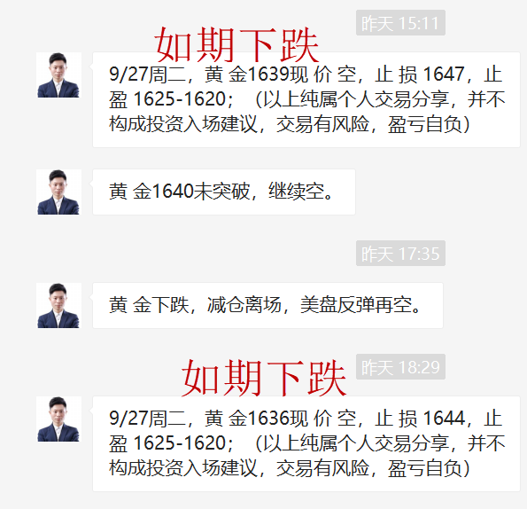 黄金昨日先跌后震荡,但王杨坚守空头不放手,分别1649干空,1642干空,全部大跌获利!日内干空两连胜,周初开门红!给力!当前黄金跌势不变,反弹仍是继续干空,早盘1640附近继续空! 黄金明显的下跌趋势!操作上一定要顺势而为!顺势轻飘飘,逆势乱糟糟!如此明显的下跌,不要轻易的抄底,只需顺势跟随,反弹
