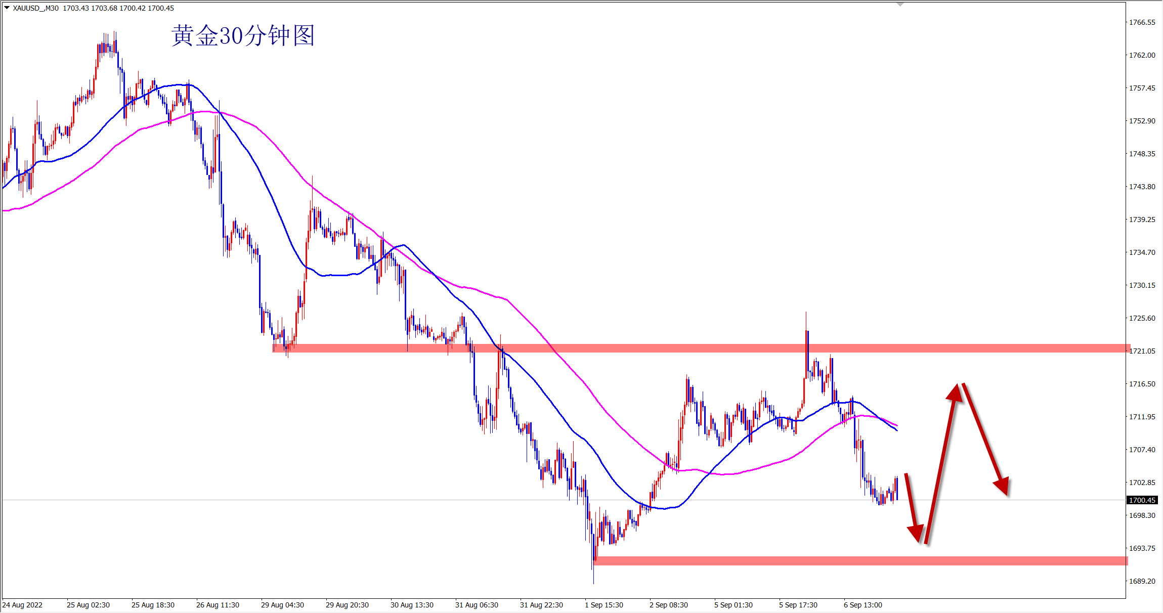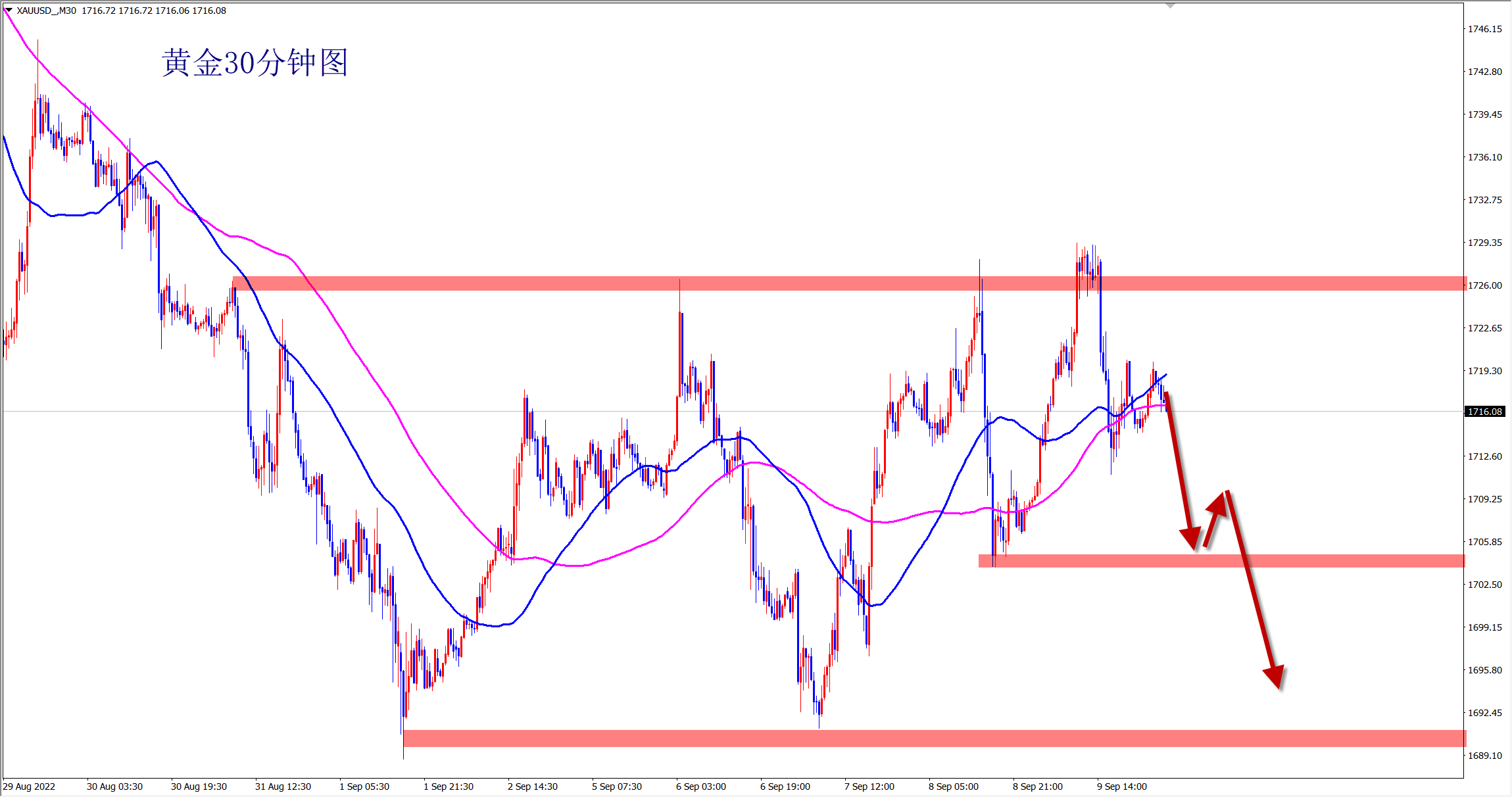黄金底部区间震荡,上方依旧没有突破1730的压力,当前走区间内的下跌段,早盘1726压力先干空看跌! 黄金当前维持1690-1730的大区间震荡走势,但是反弹没有突破关键压力,整体还是空头跌势!不破不立,破位翻转!而且当前正好反弹至上方压力遇阻,行情回头向下!早盘依托压力位置先空,下方关注1703的支撑,破位看跌