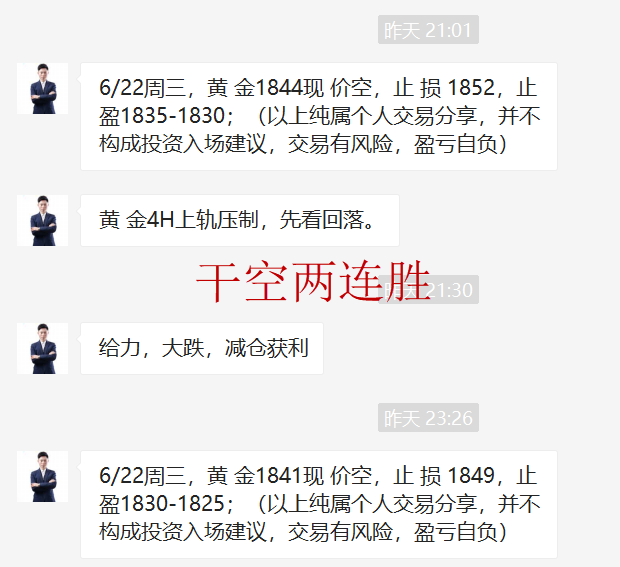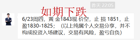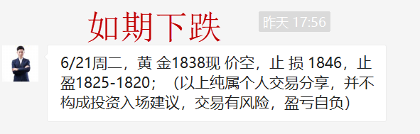 黄金昨日先跌后大涨,但是王杨并没有追多,而是分别在1844和1841位置干空,如期下跌,日内干空两连胜!当前行情没有突破1848压力前,继续高空! 黄金最近走势反复无常,非常折腾,但是依旧有规律可循,操作上不能过度追涨杀跌,没有延续性!今日黄金上方还是关注1848的压力,此位置下继续高空看跌,下方的支撑