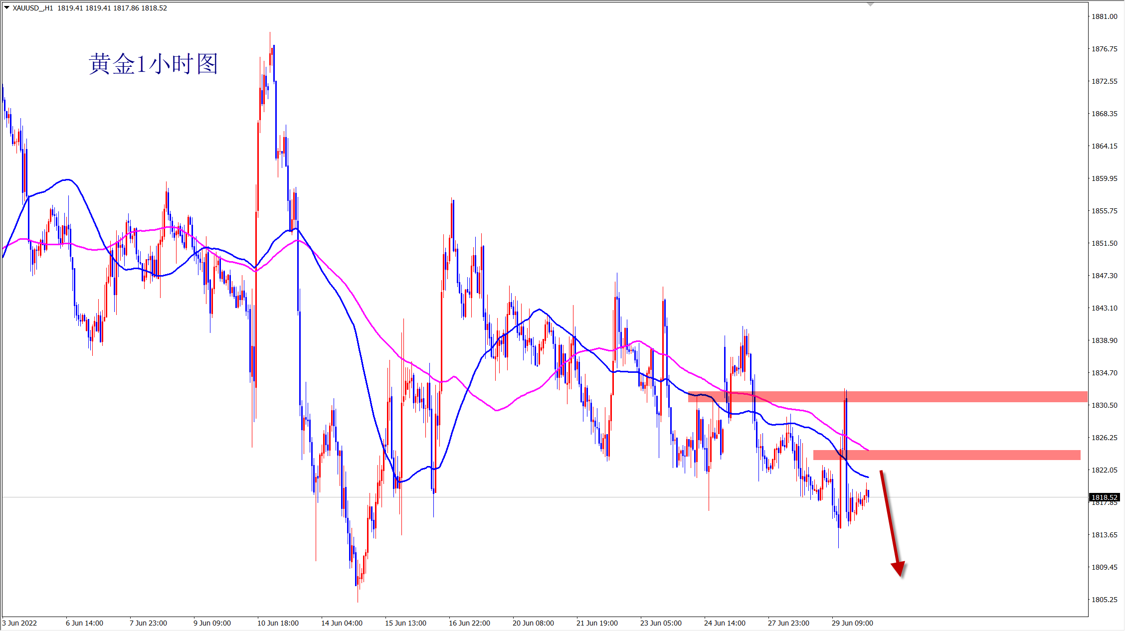 黄金震荡下行走势,反弹无力,阴跌不止,昨日我们1838空如期下跌!今日直接跌破1830的支撑,继续下行!继续空! 黄金当前是慢节奏的走势,操作上要在关键的压力位置进场,否则来回折磨心态。当前的压力是1836位置,早盘反弹后继续空!慢节奏的行情,保持耐心,震荡越久,爆发力越强,一旦开始新趋势,必是爆发