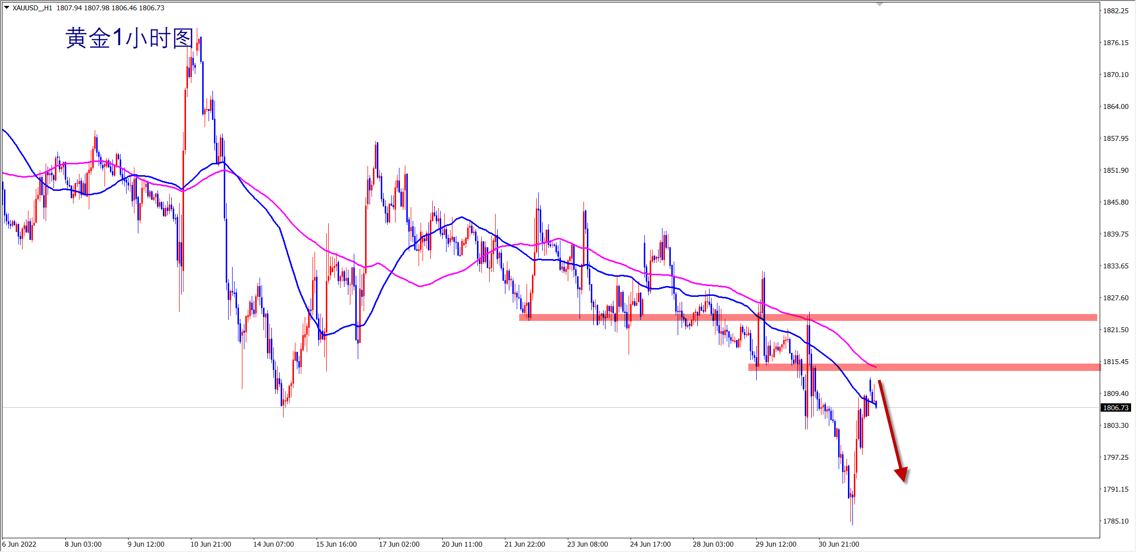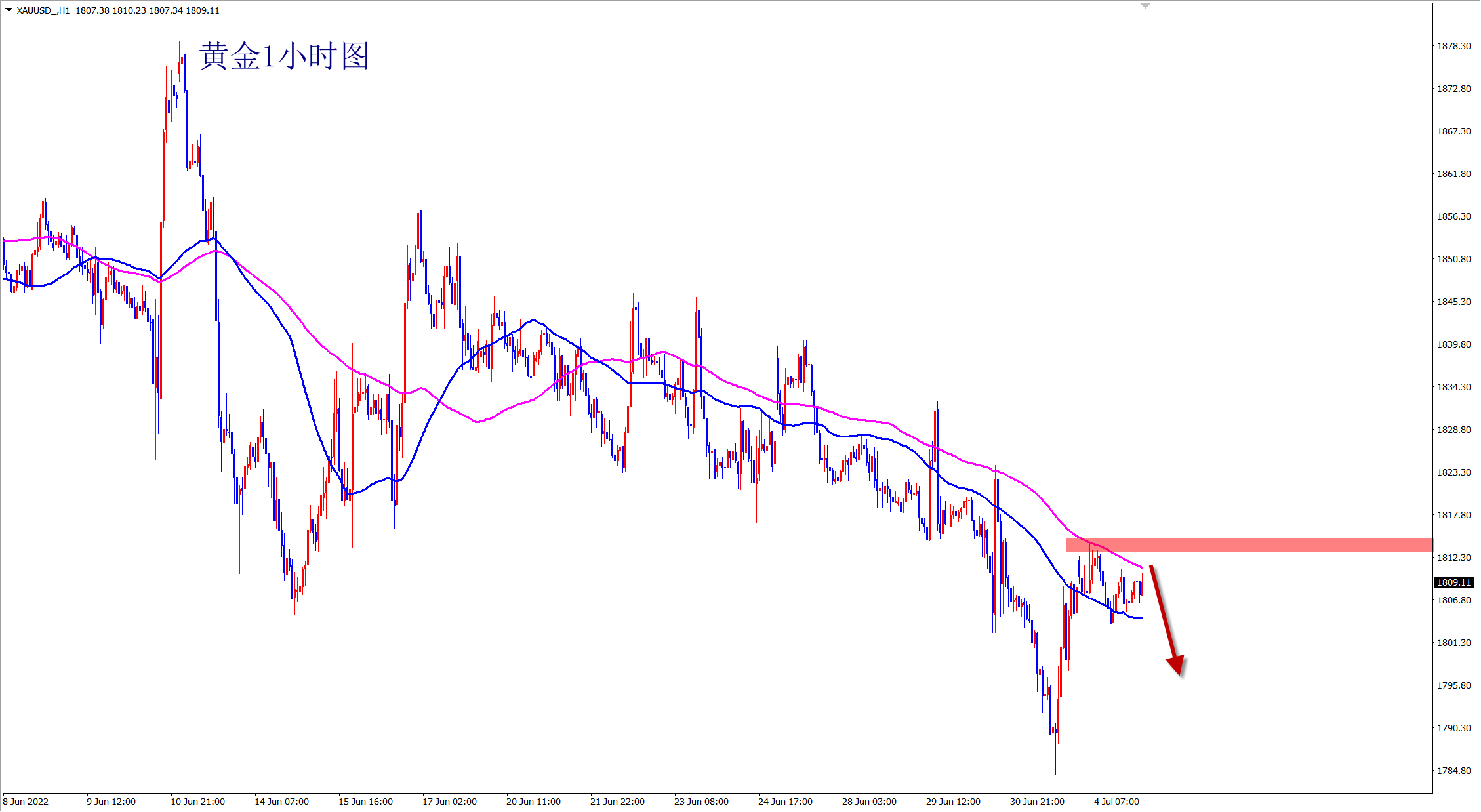 黄金当前的反弹受到1815位置的压制,空头跌势不变,反弹继续干空,早盘依托1815的压力直接空! 黄金当前明显的下跌趋势,1小时级别上,黄金一直是受到均线的压制下行,而且反弹高点形成下跌趋势线压制,昨日的反弹也是再次受到长期均线的压制,反弹无力,震荡后还将继续下跌! 空,早盘1815的压力继续干空!顺
