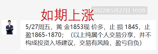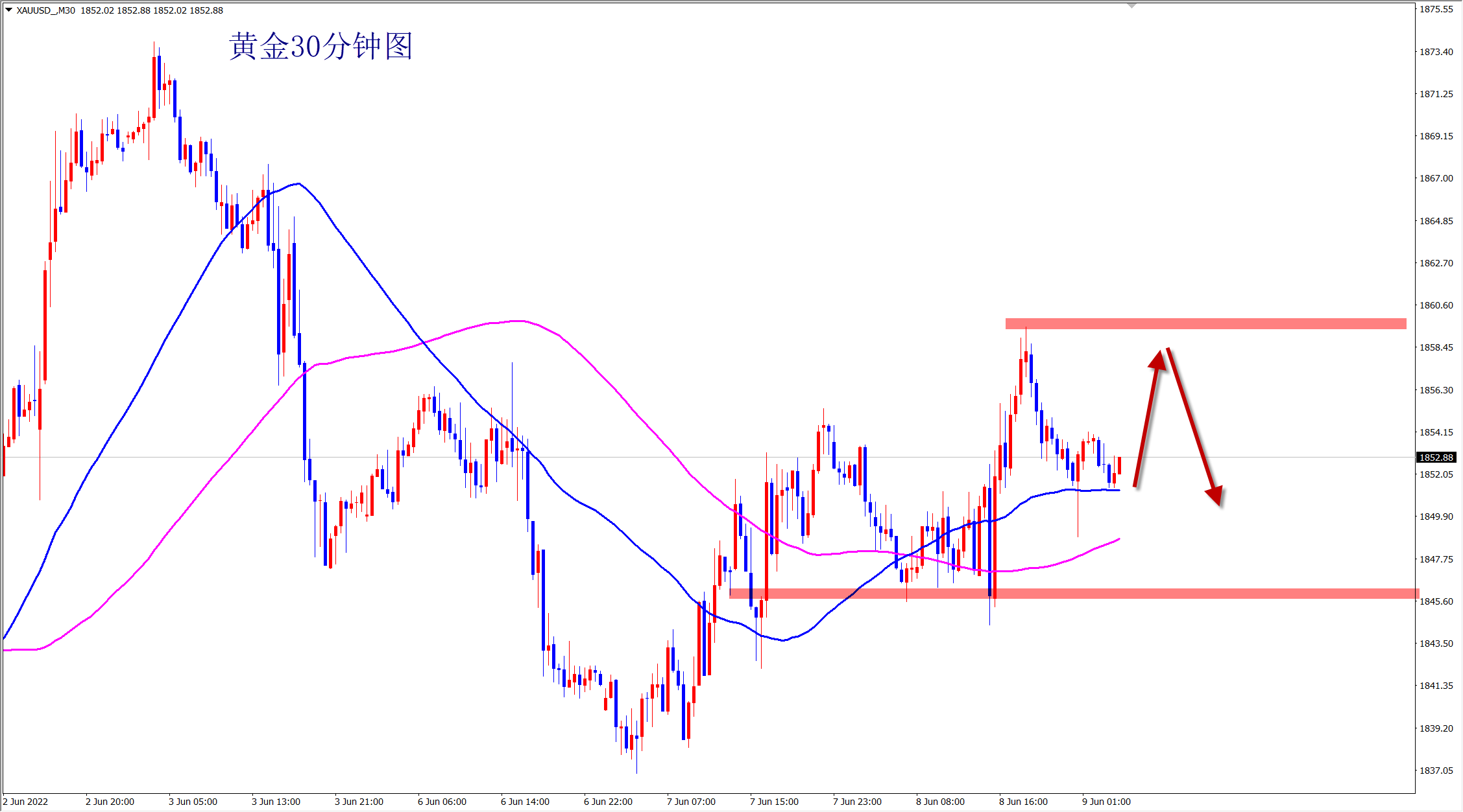 黄金本周行情走势以震荡为主,多空都不延续,一日涨一日跌势常态,而且日内波动幅度也有限,操作上对于点位的把握要更加精准!今日黄金预计是1845-1860的区间震荡走势,高抛低吸操作! 黄金本周的震荡幅度开始收窄,这是行情即将变盘的信号,同样多空也是扑朔迷离,多空力量较量的难解难分,看似强,随时转弱,看似