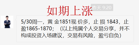 黄金周五我们提示1850支撑干多看涨,1853的多单如期上涨。当前多空反复,但是站稳在1840支撑上方,还是多头上涨走势不变,早盘依托1840的支撑继续干多! 黄金从底部反弹,虽然短线遇阻1870后开始回调,但是多次下跌都受到1840位置的支撑,非常强势。而当前依旧是多头反弹上涨的走势,震荡结束后必将会再次突破