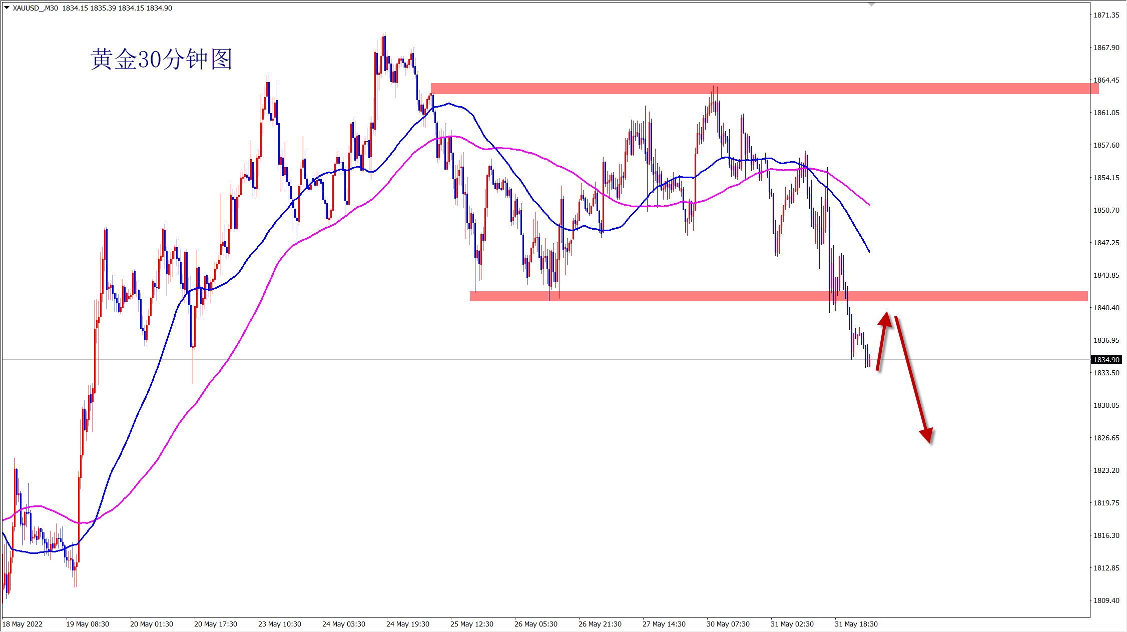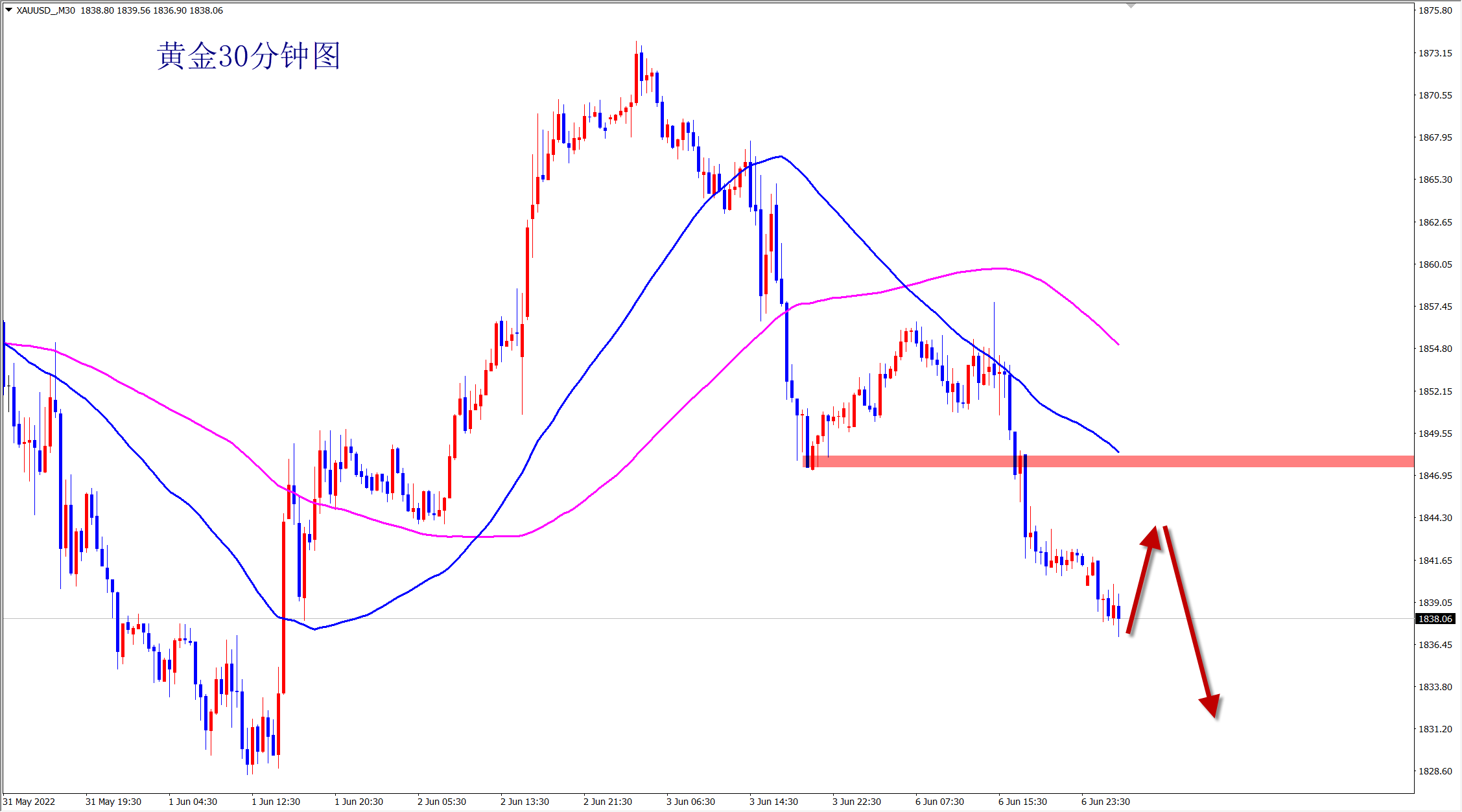 黄金昨日震荡后最终在凌晨选择破位下跌,方向已经转变,操作思路就要及时改变,早盘顺势直接空,1840直接空! 黄金当前经过盘整震荡后选择破位下跌,而且是刚刚开始,就不会轻易结束。破位后多空转换,支撑变压力,当前1840将是反弹的关键阻力,反弹依托此位置干空看跌。 交易就是如此,没有只涨不跌的走势,